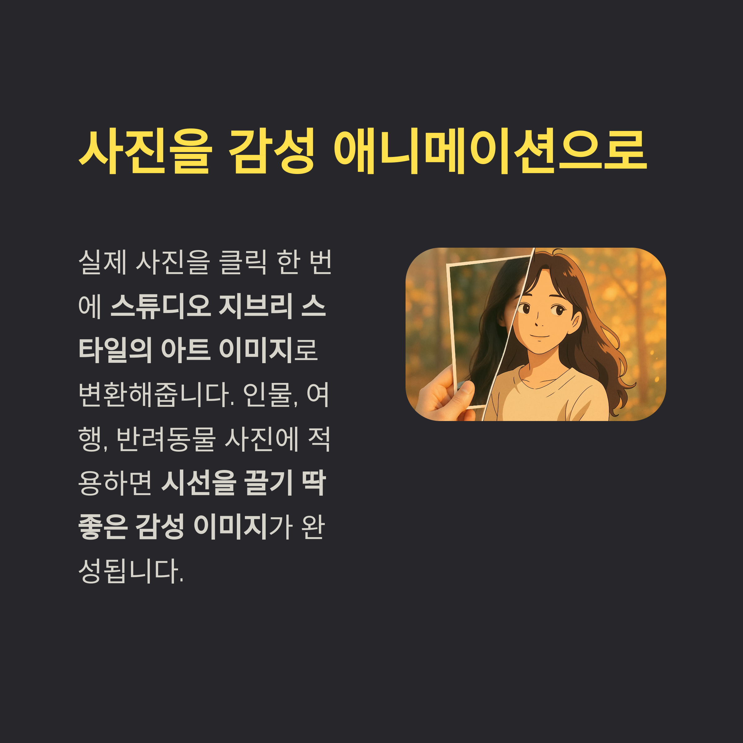 | 스튜디오 지브리 필터 | 사진을 애니메이션 스타일로 변환 | SNS 썸네일, 브랜딩 이미지 |