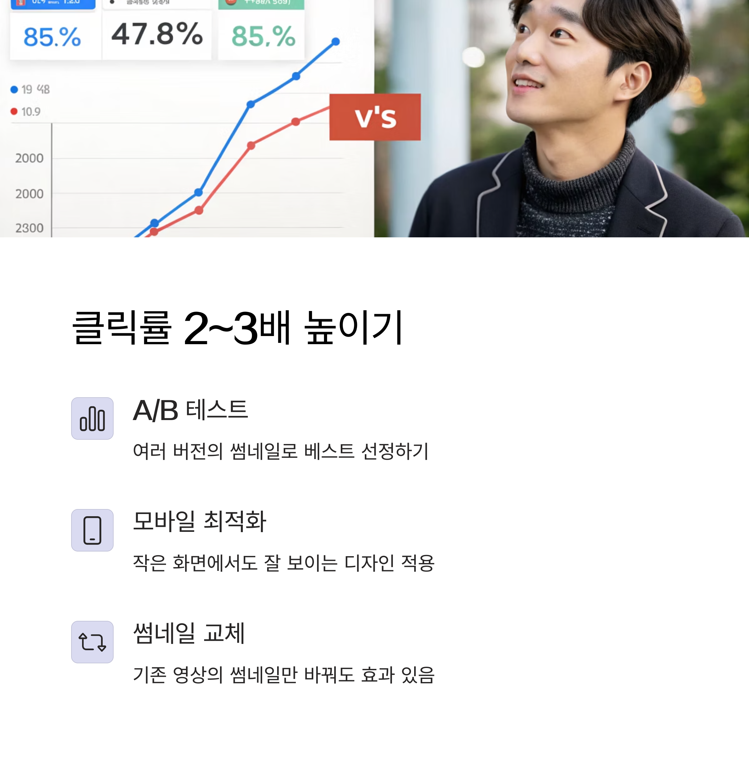 네, 경우에 따라 썸네일 수정만으로 CTR이 2배 이상 뛰기도 해요. 수정 실험은 정말 필수입니다!