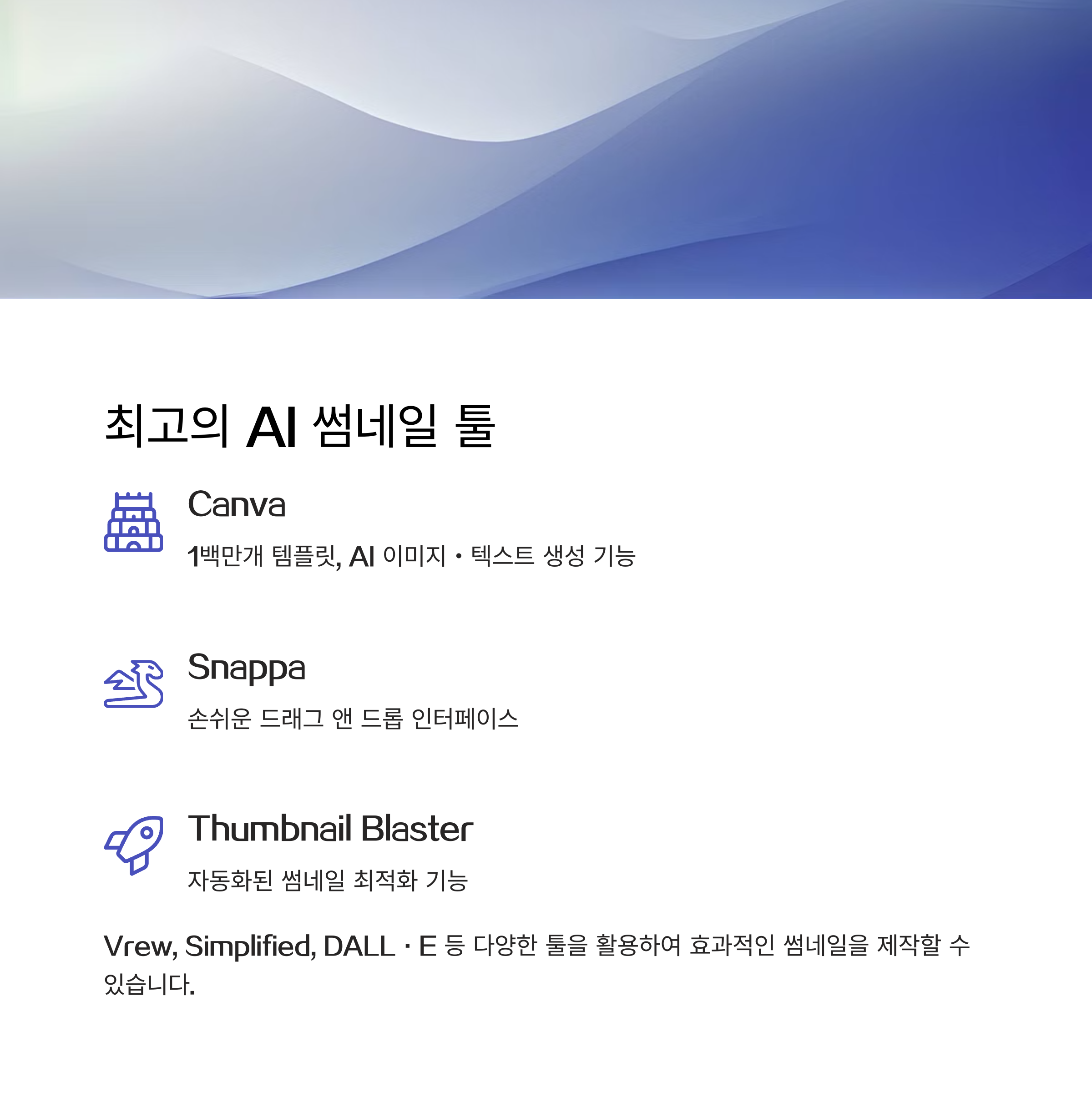 | Thumbnail Blaster | AI로 CTR 최적화 썸네일 추천 | A/B 테스트 기능 제공 |