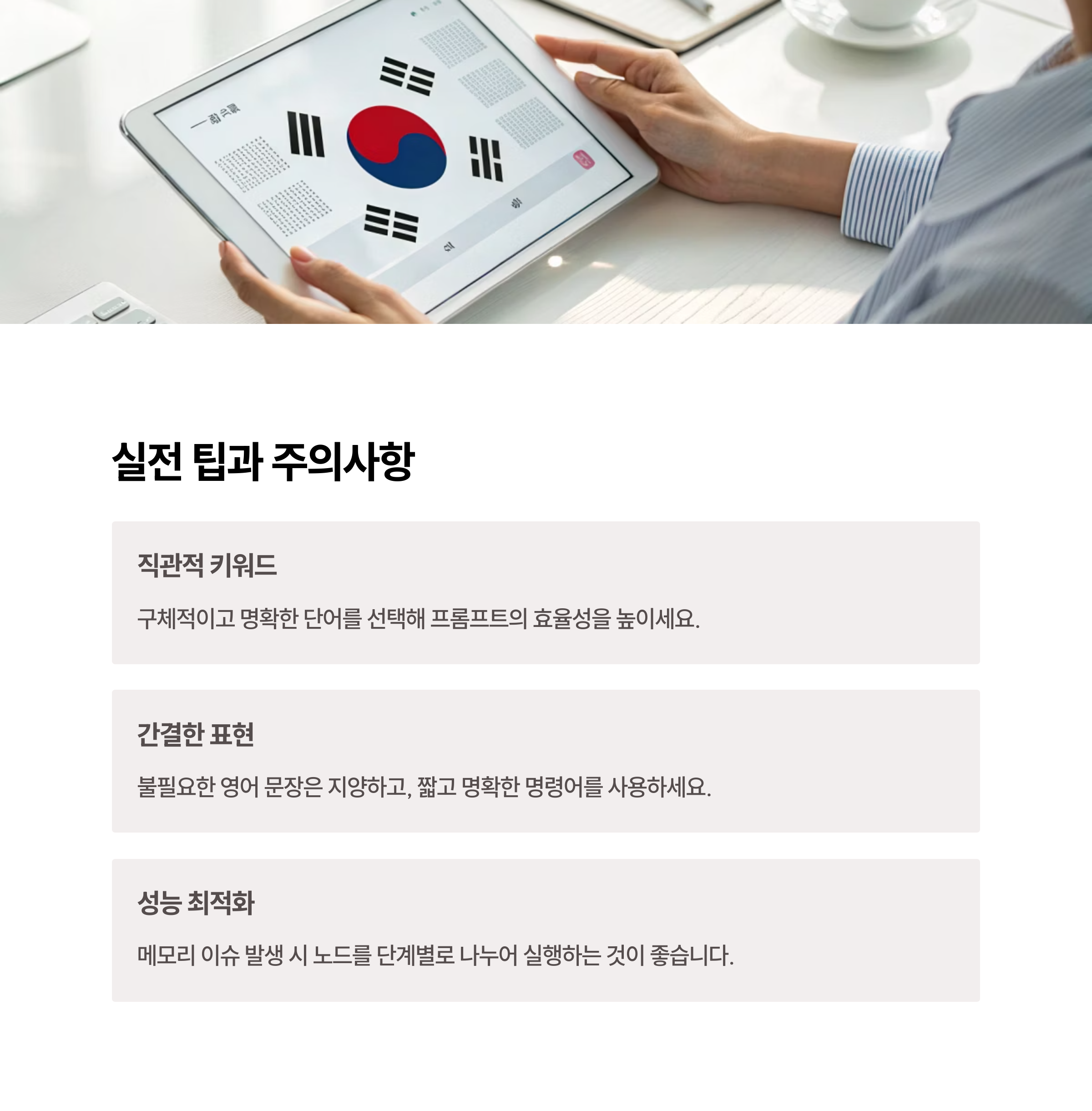 - 한국어 스타일을 "자연스럽고 현대적"으로 요청하면 훨씬 읽기 좋은 문장이 나옵니다