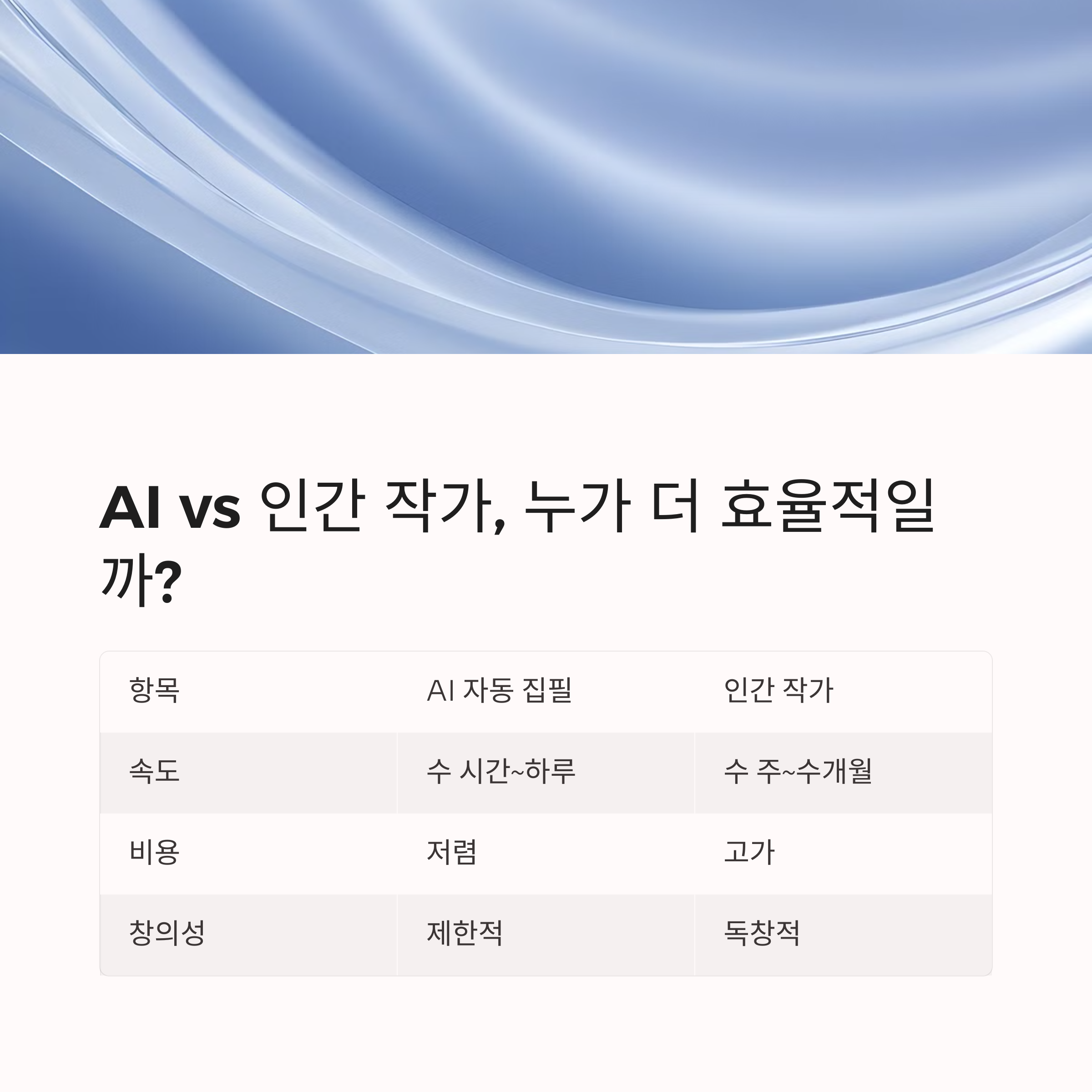 | 항목 | AI 자동 집필 | 인간 작가의 집필 |