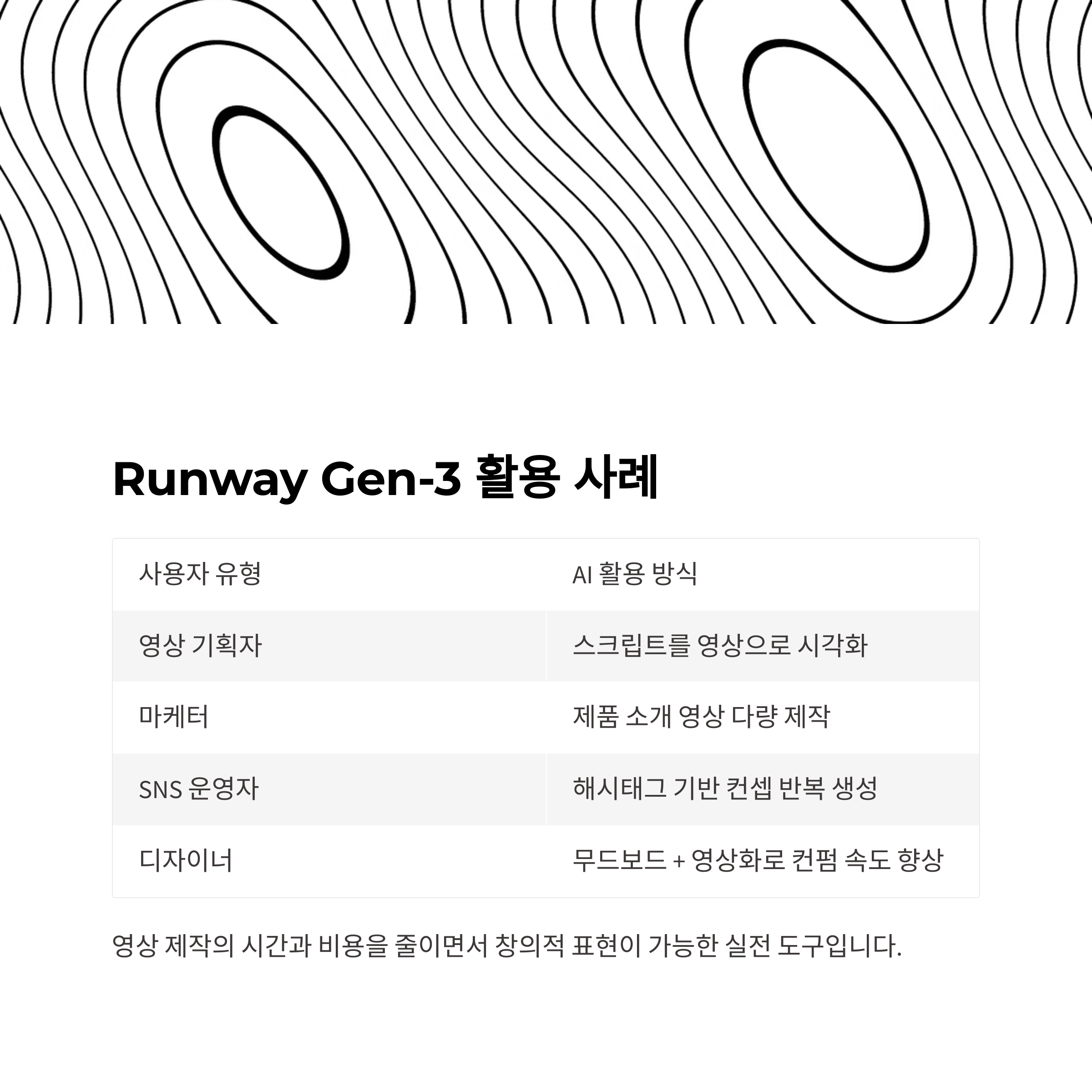 영상 제작의 시간과 비용을 줄이는 동시에, 창의적인 표현이 가능하다는 점에서 Runway Gen-3는 실전 경쟁력을 갖춘 도구입니다.