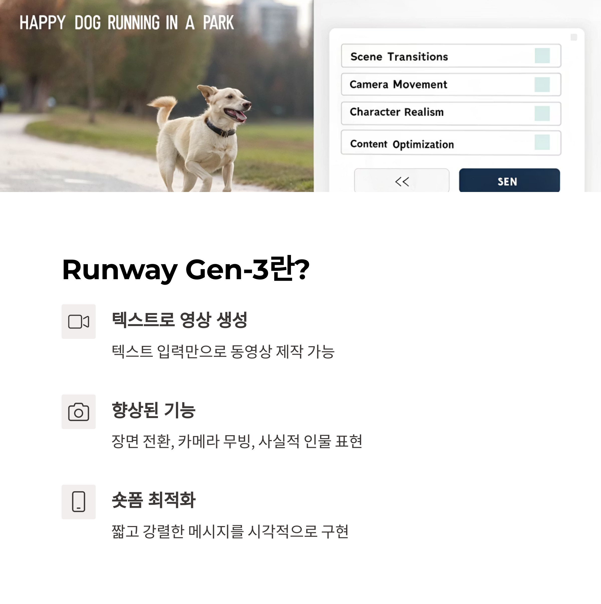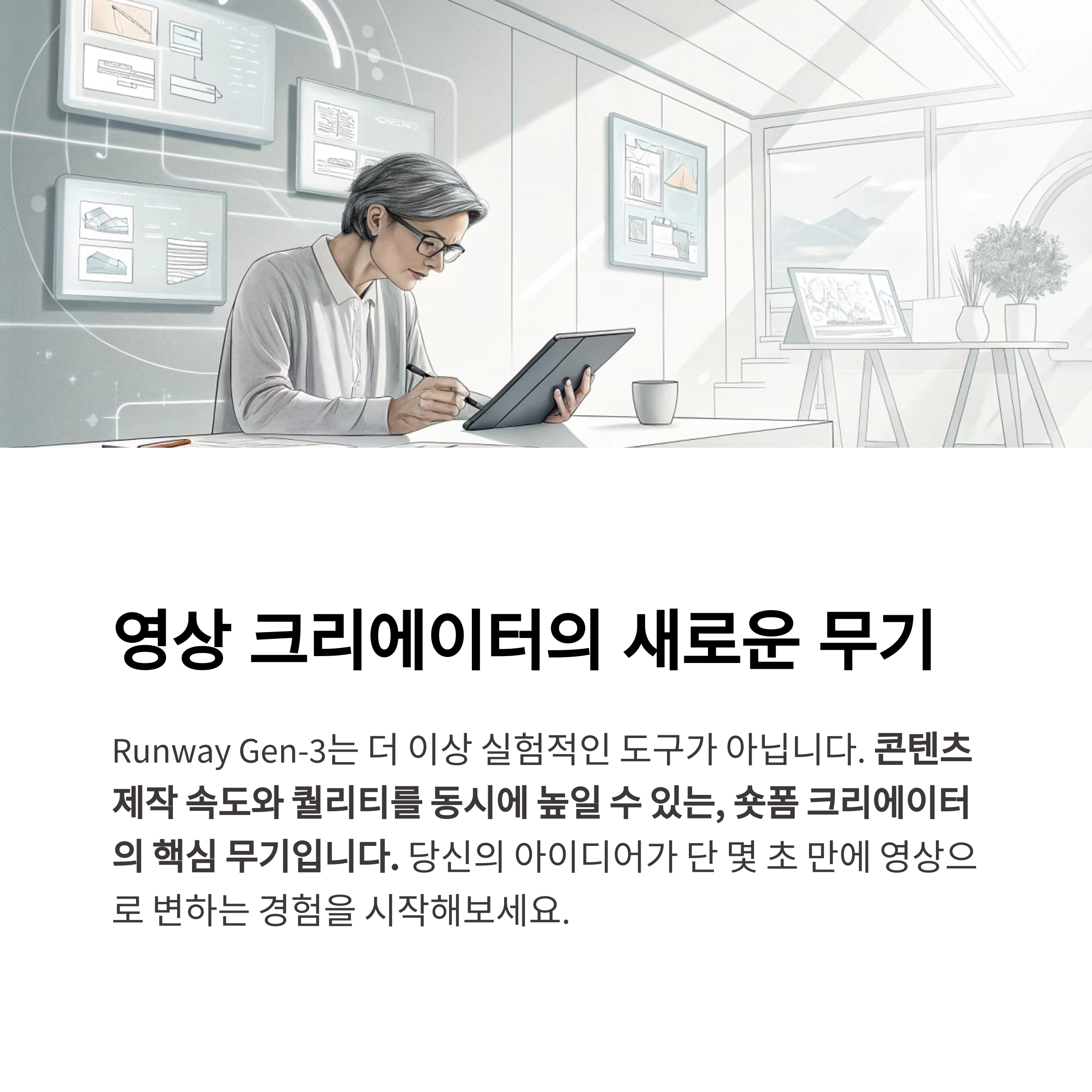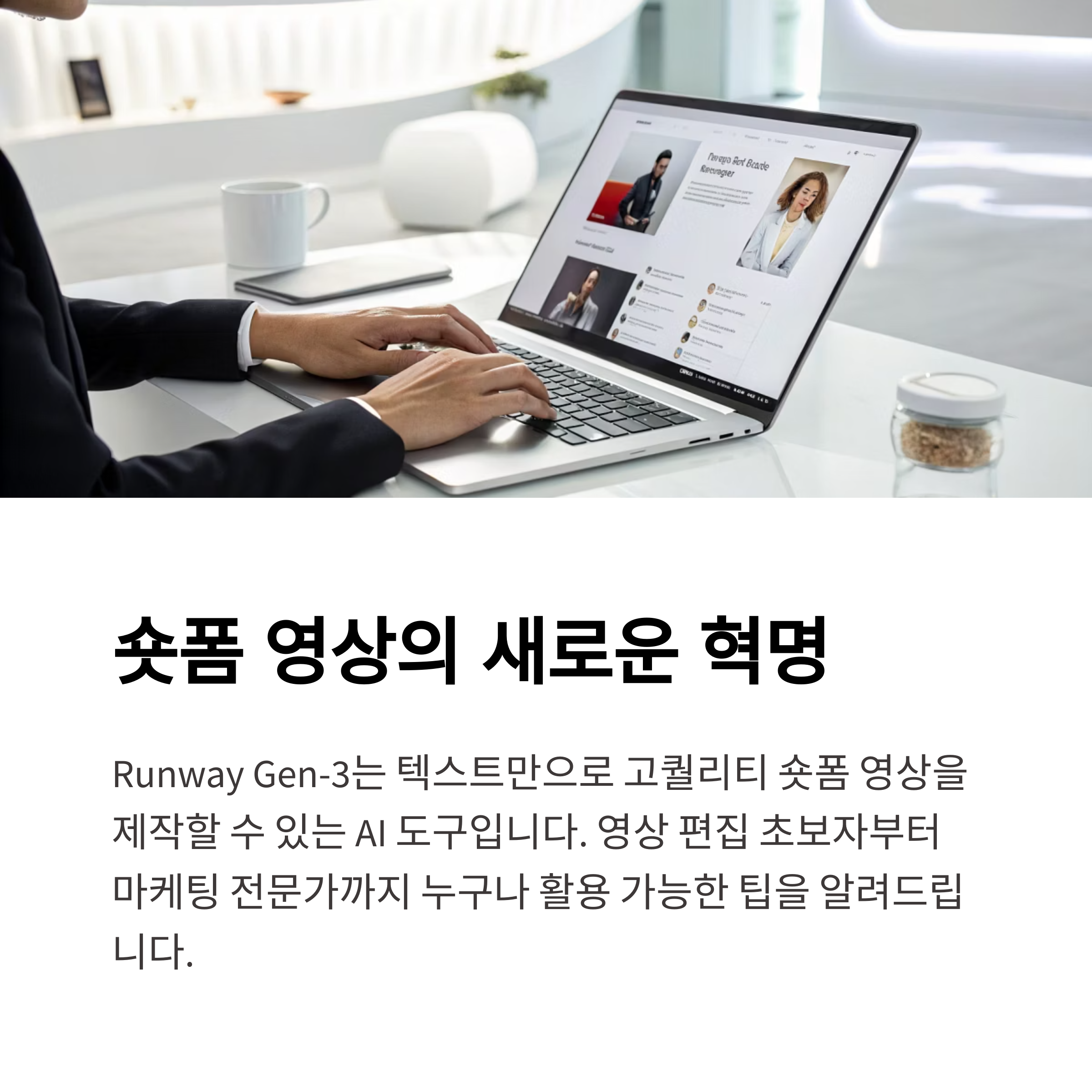 Runway Gen-3는 AI 영상 생성 분야에서 주목받는 도구로, 텍스트만으로도 고퀄리티 숏폼 영상을 제작할 수 있습니다.