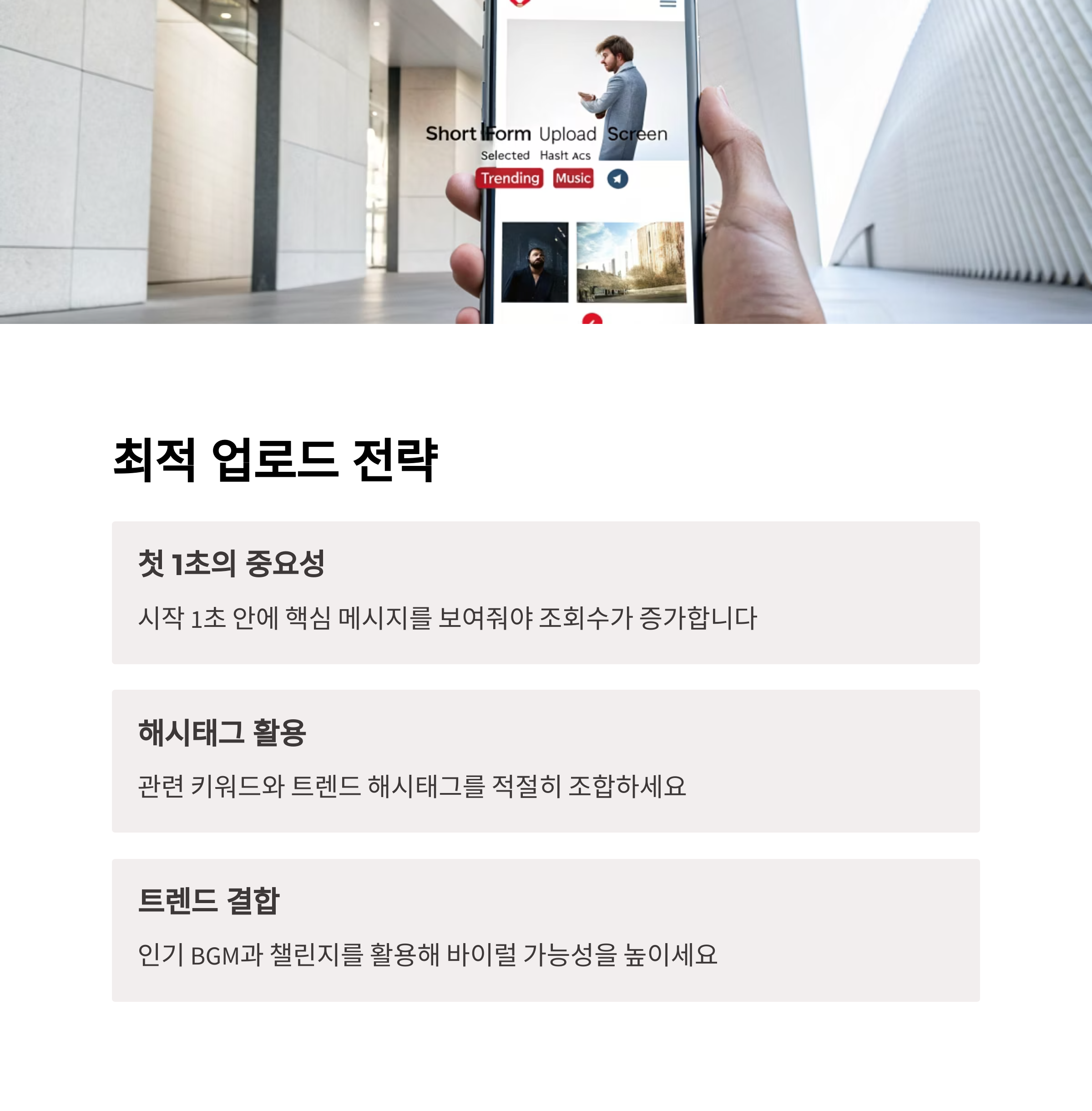 또한 해시태그 구성은 필수이며, 인기 BGM과 트렌드 챌린지를 결합하면