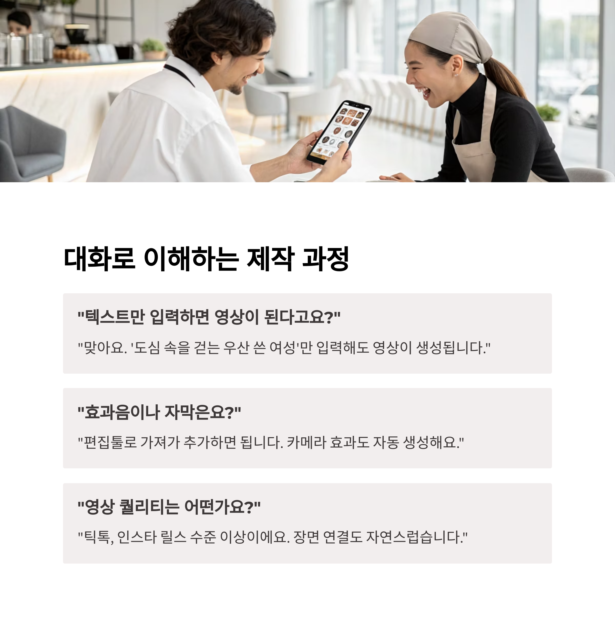 영상 촬영 없이도 광고, 브이로그, 모션그래픽 스타일의 콘텐츠를 자유롭게 생성할 수 있어