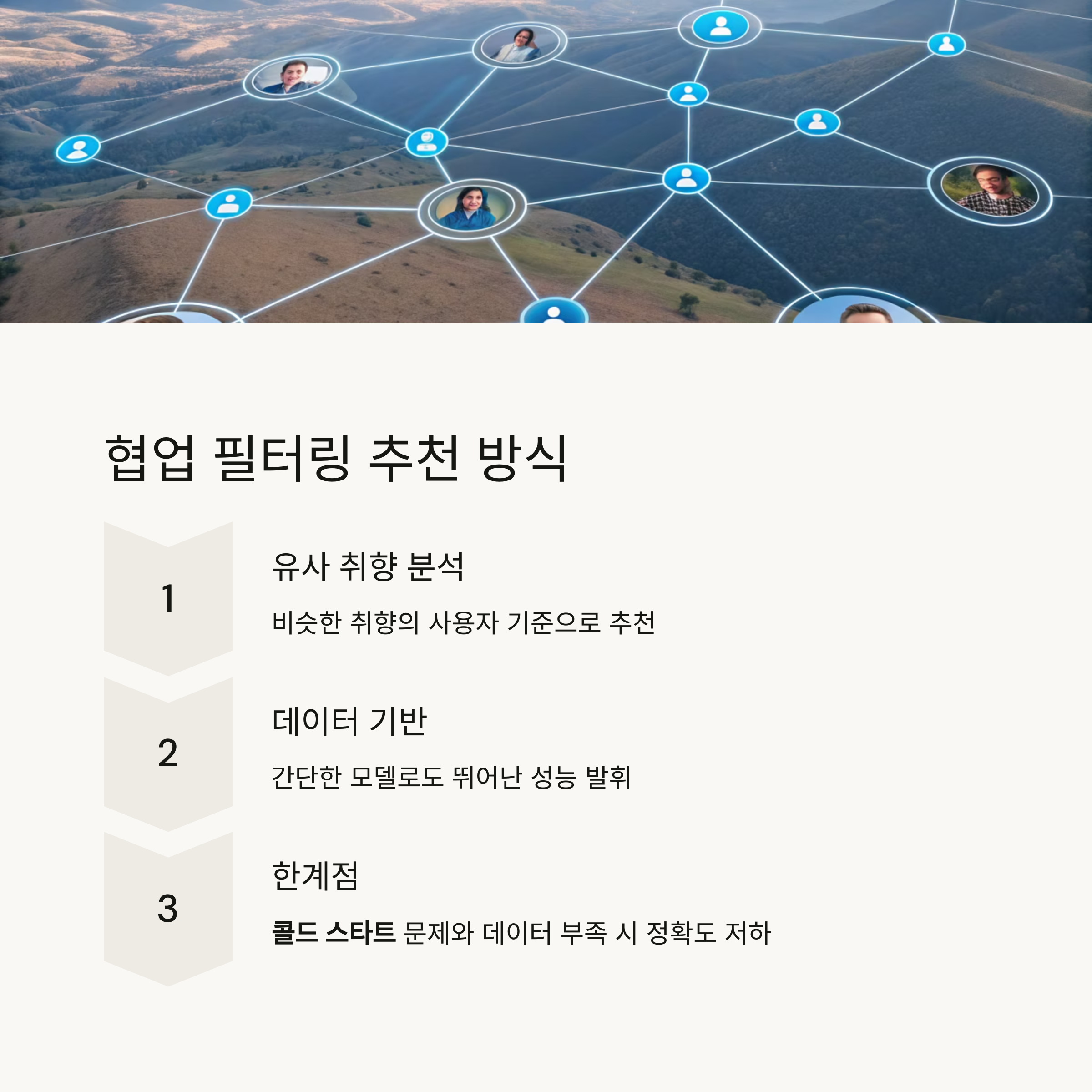 하지만 **신규 사용자 문제(콜드 스타트)**가 발생할 수 있으며,