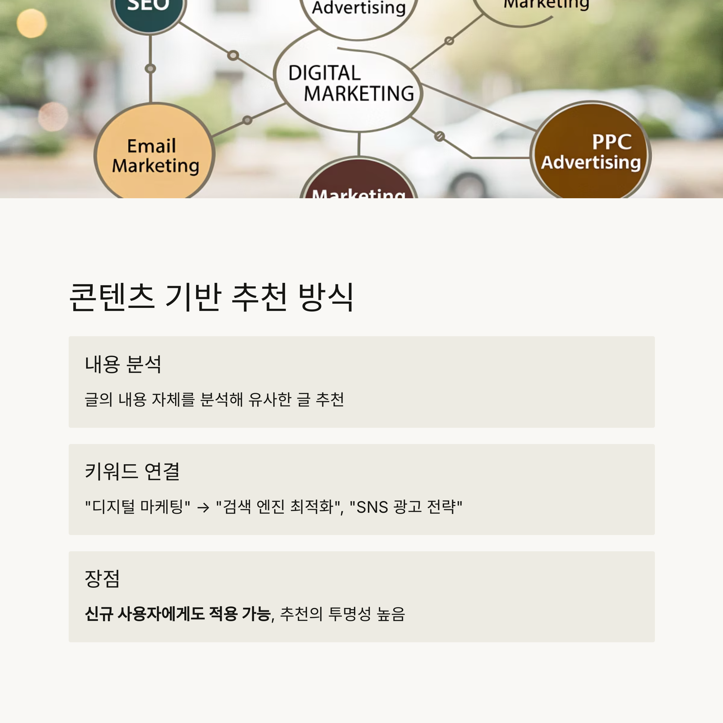 "검색 엔진 최적화", "SNS 광고 전략" 등 유사한 주제의 글을 추천하게 됩니다.