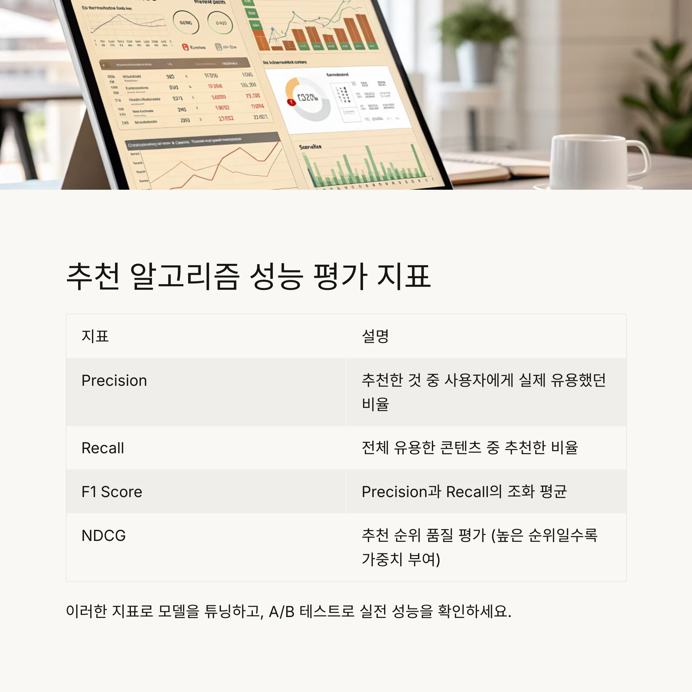 이러한 지표를 바탕으로 모델을 계속 튜닝하고, A/B 테스트를 통해 실전 성능을 확인해야 합니다.