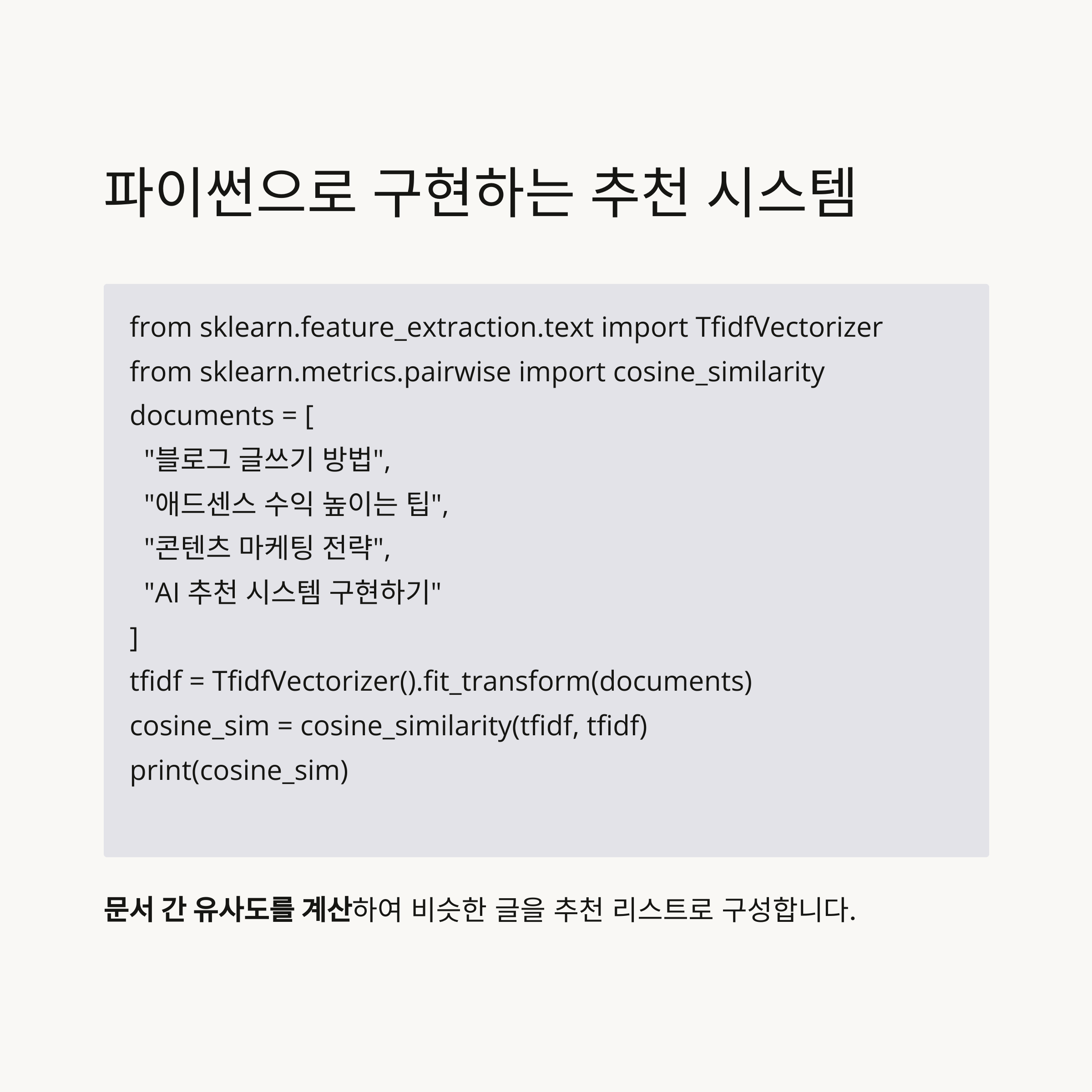 documents = [ "블로그 글쓰기 방법", "애드센스 수익 높이는 팁", "콘텐츠 마케팅 전략", "AI 추천 시스템 구현하기" ]