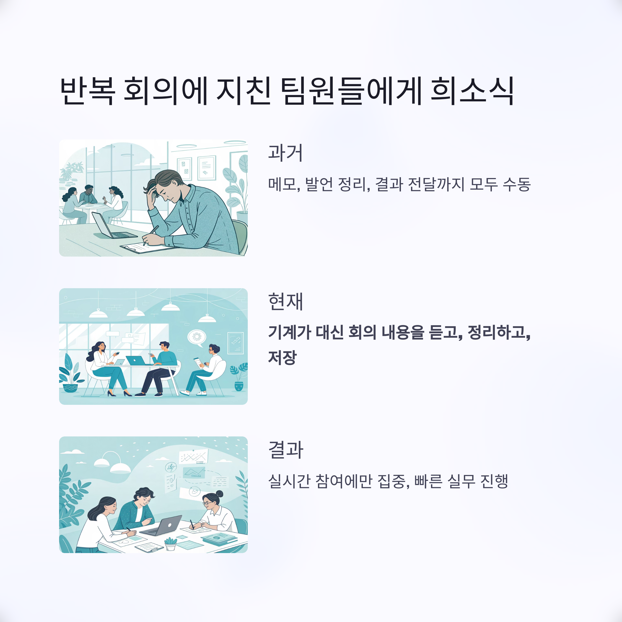 이제는 회의가 더는 피로 요소가 아닌, 실행 중심 도구로 전환됩니다.
