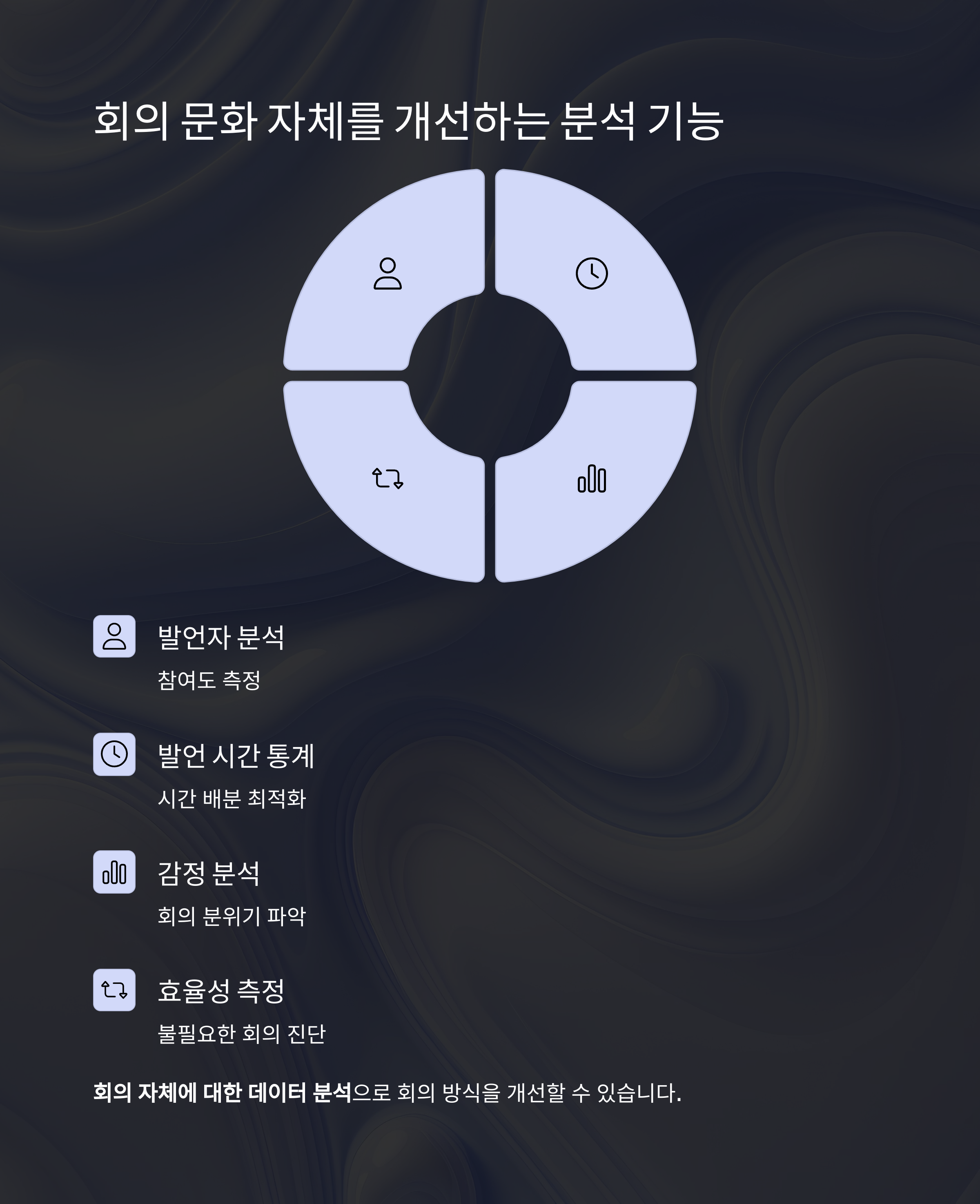 발언자 분석, 발언 시간 통계, 감정 분석 등 회의 자체에 대한 데이터 분석도 제공합니다.