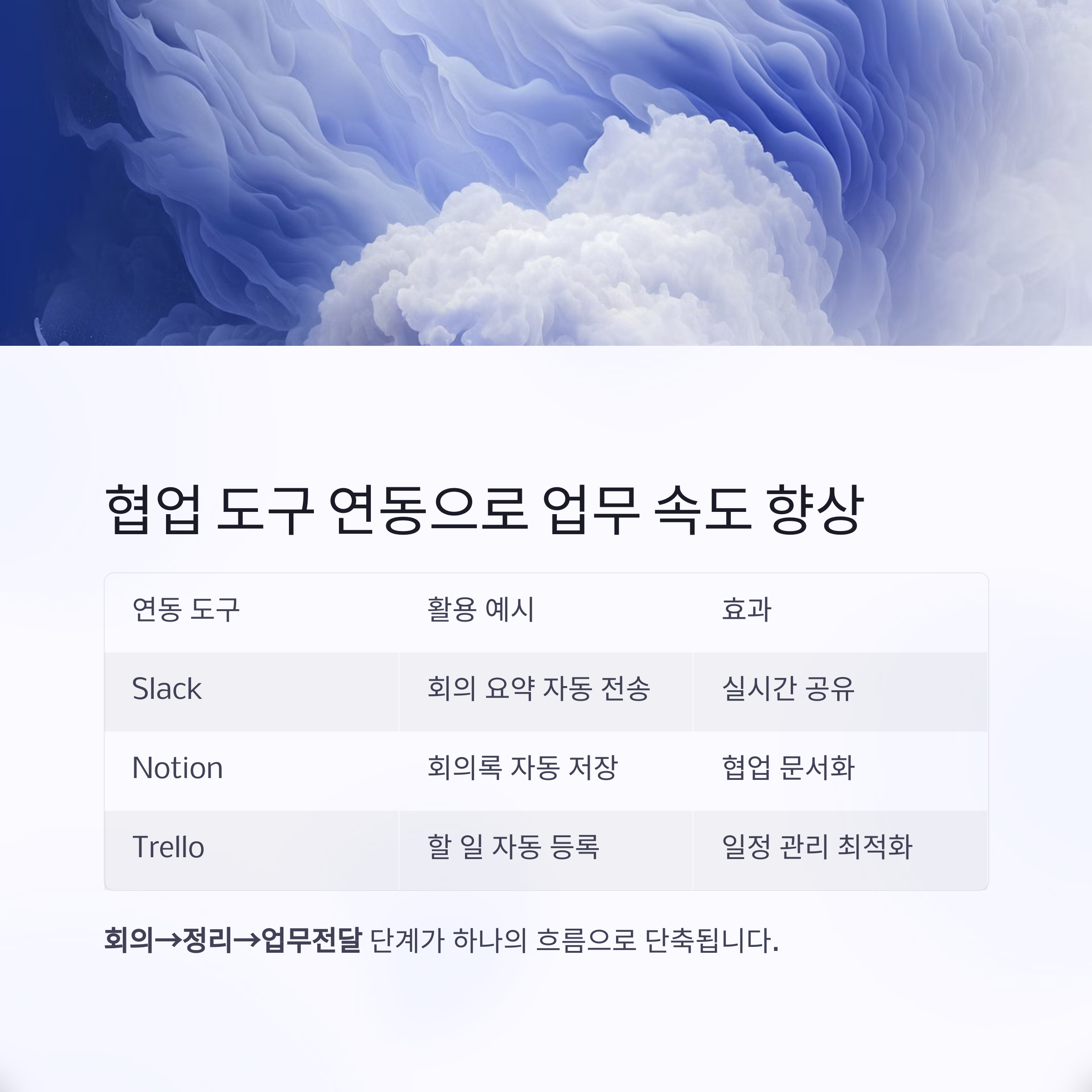 | Slack | 회의 요약 자동 전송 | 실시간 공유 |