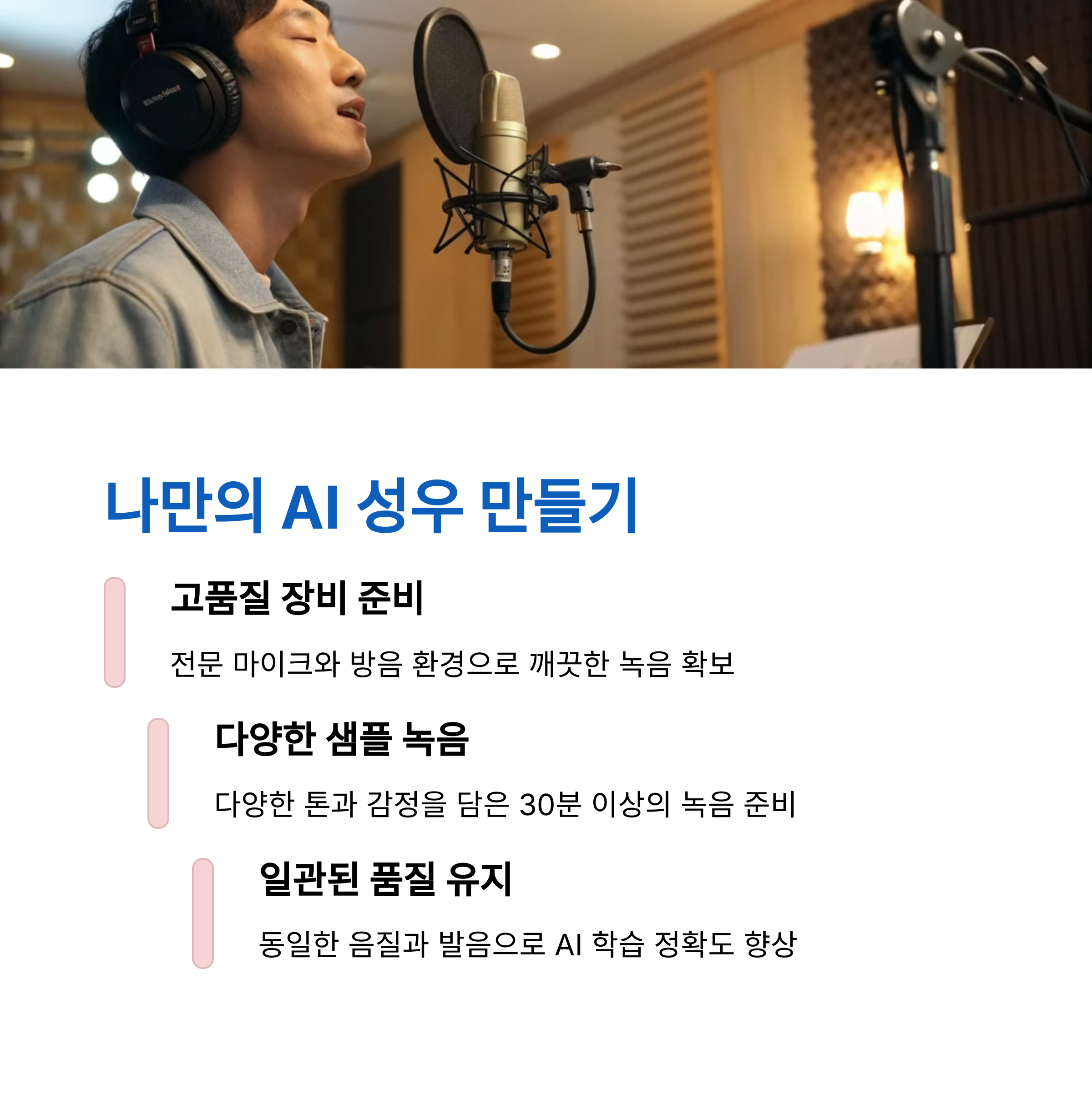AI 음성 생성기의 매력은 맞춤형 보이스를 만들 수 있다는 점이에요. 단순히 제공되는 음성 샘플을 쓰는 것보다, 직접 녹음한 내 목소리를 AI가 학습하게 해서 ‘나만의 성우’를 제작할 수도 있죠. 그 과정에서 몇 가지 팁을 알려드릴게요.