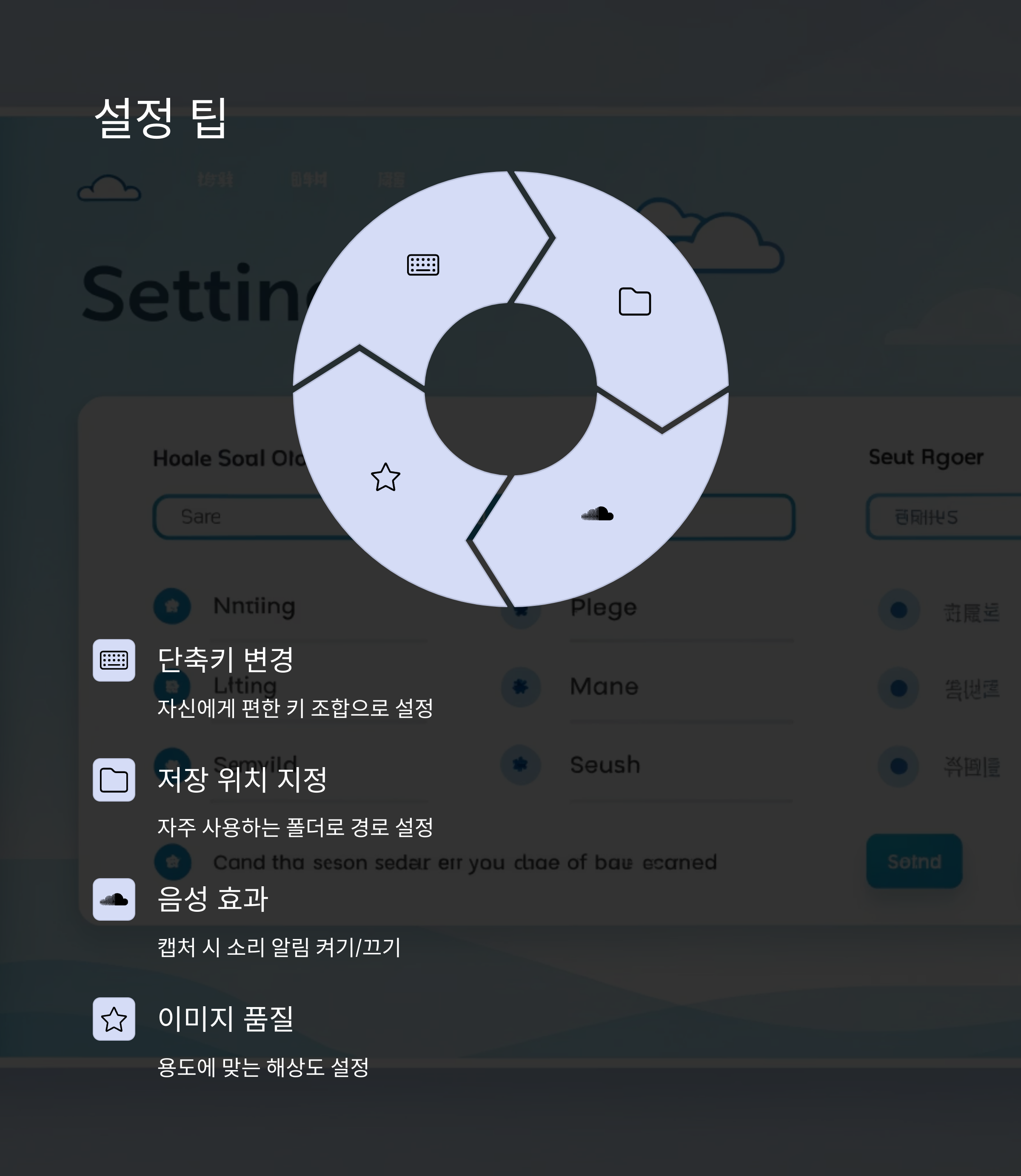 설정 메뉴에서는 단축키 변경, 파일 저장 위치 지정, 캡처 음성 효과 유무 등을 조정할 수 있습니다.