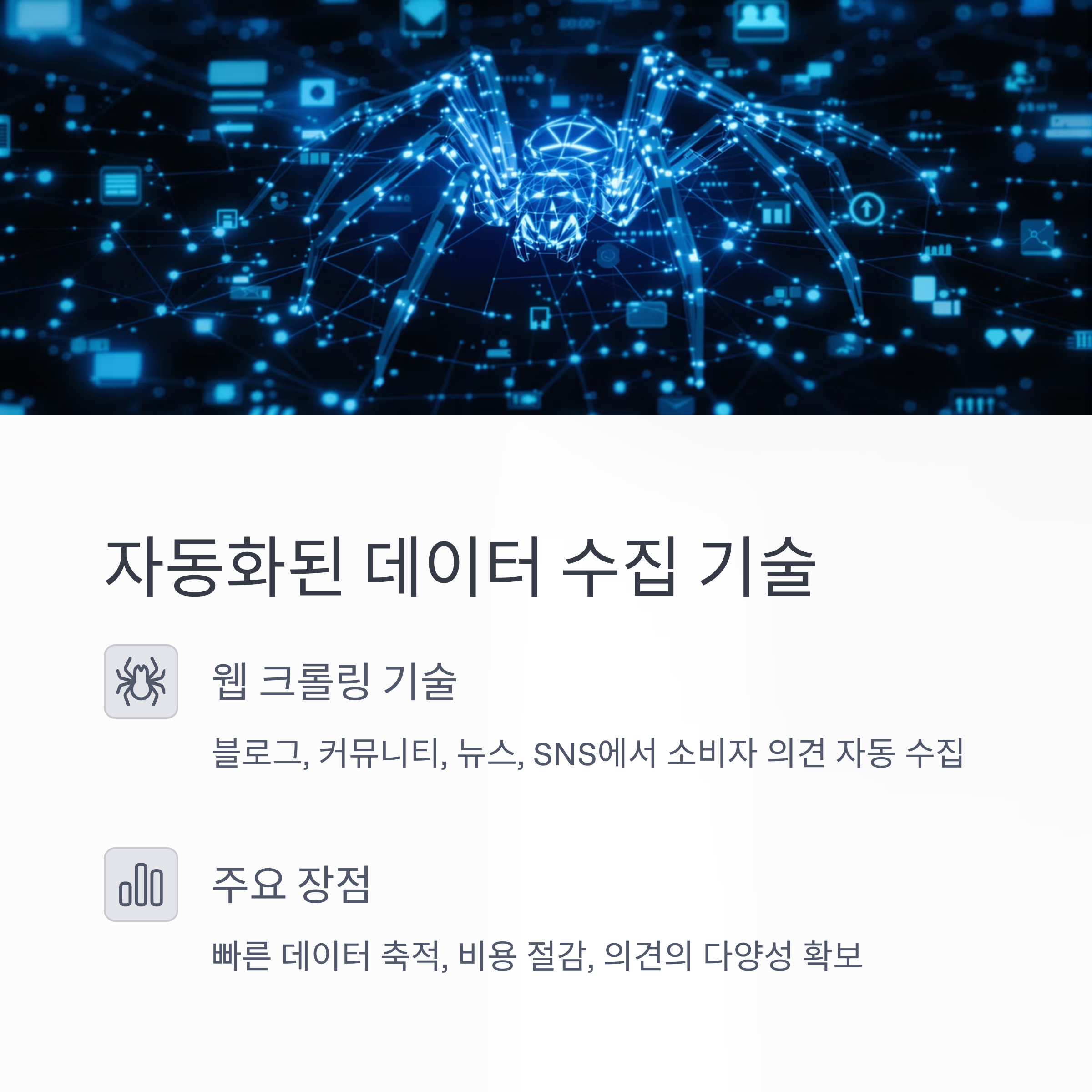 블로그, 커뮤니티, 뉴스, SNS 등에서 소비자 의견을 자동 수집합니다