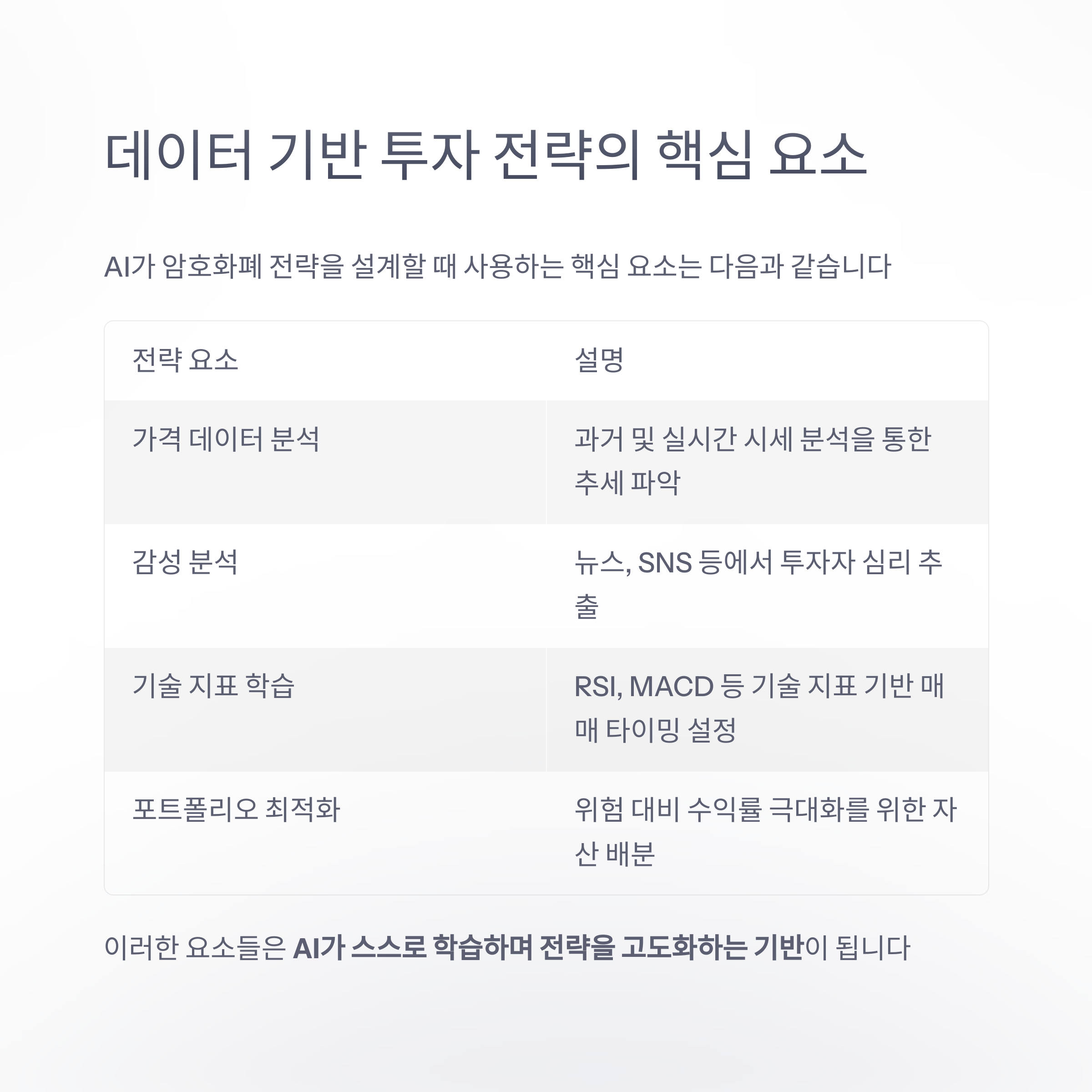 AI가 암호화폐 전략을 설계할 때 사용하는 핵심 요소는 다음과 같습니다