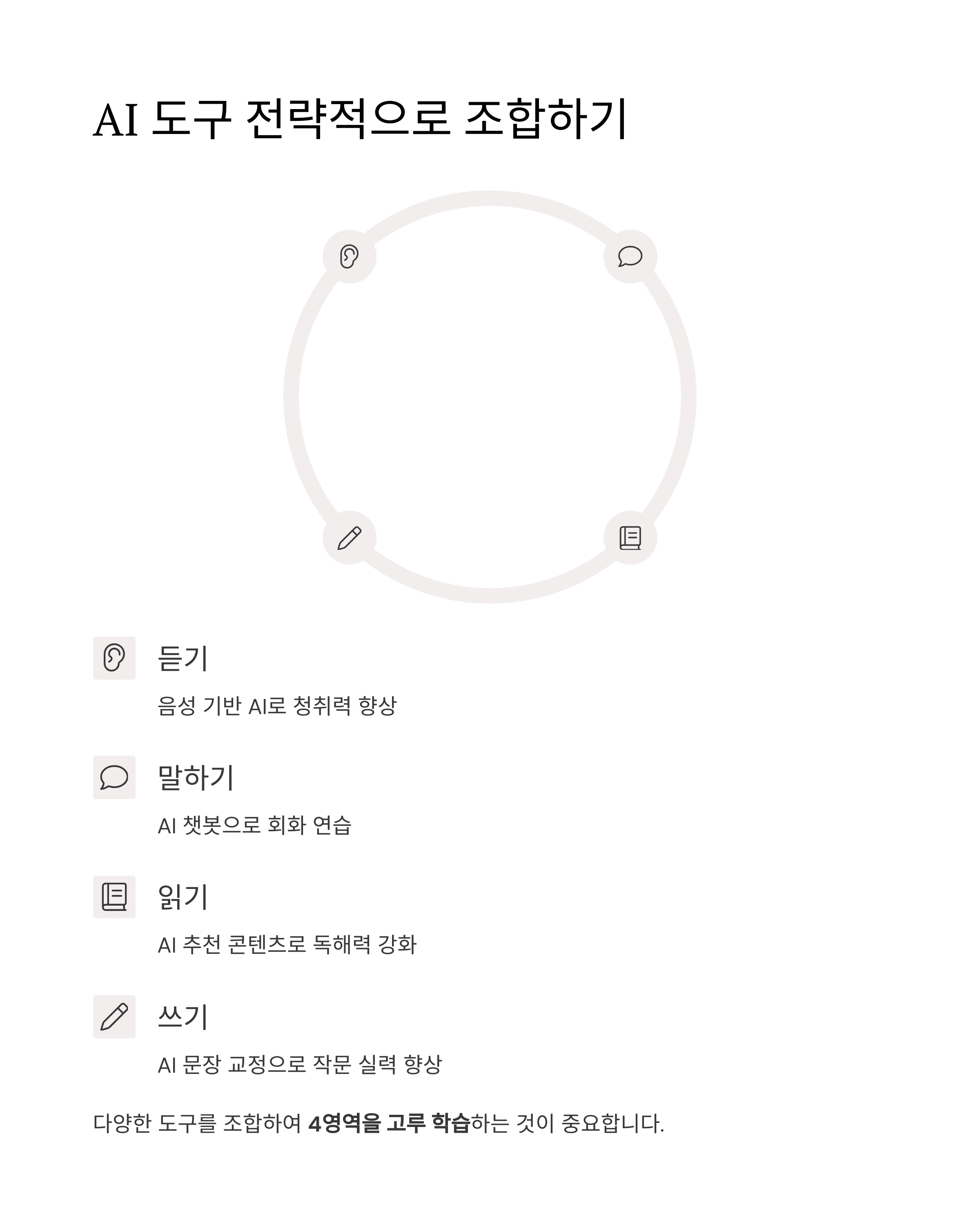듣기, 말하기, 읽기, 쓰기 4영역을 고루 학습하는 것이 중요합니다