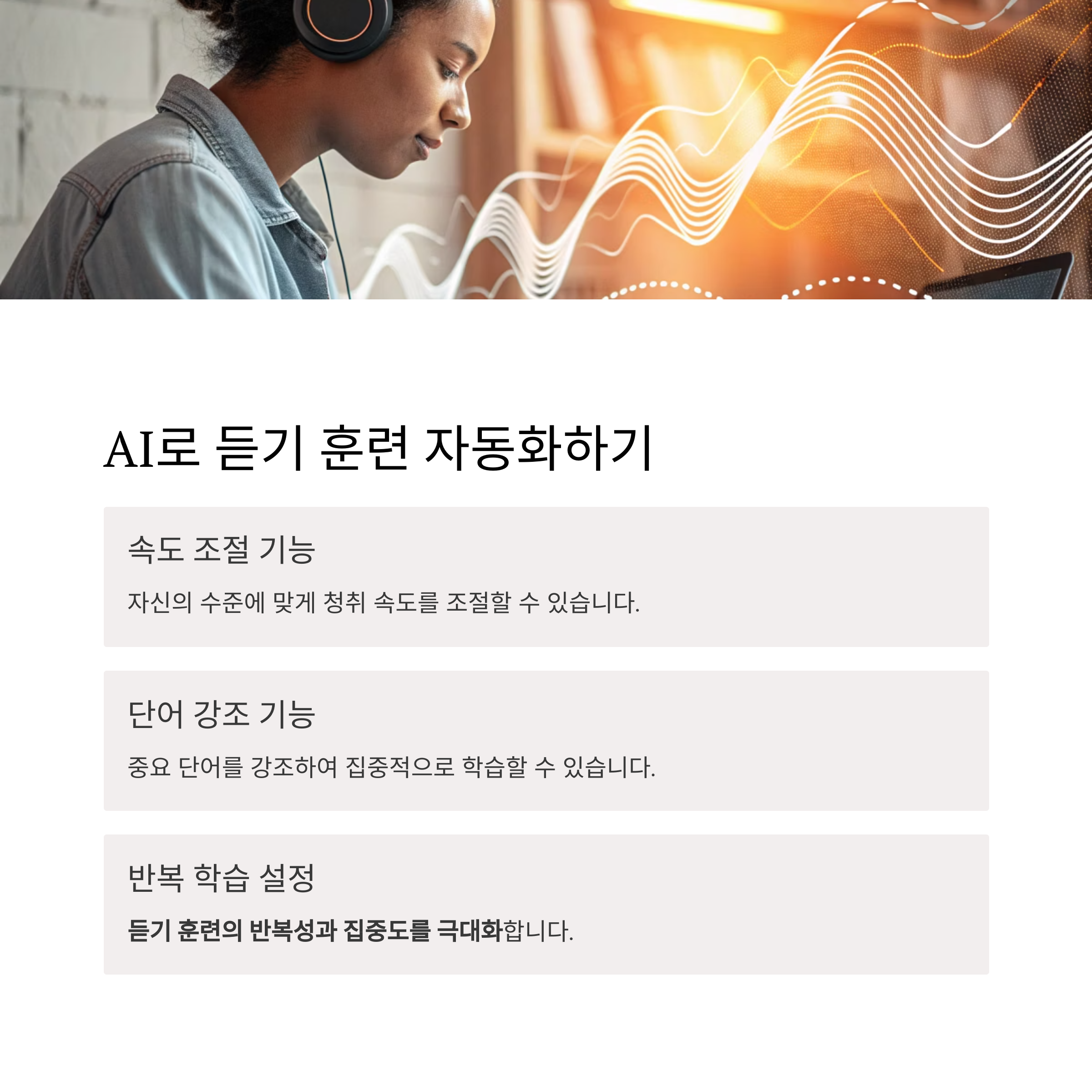 AI는 청취 속도 조절, 단어 강조, 반복 설정 등의 기능을 통해