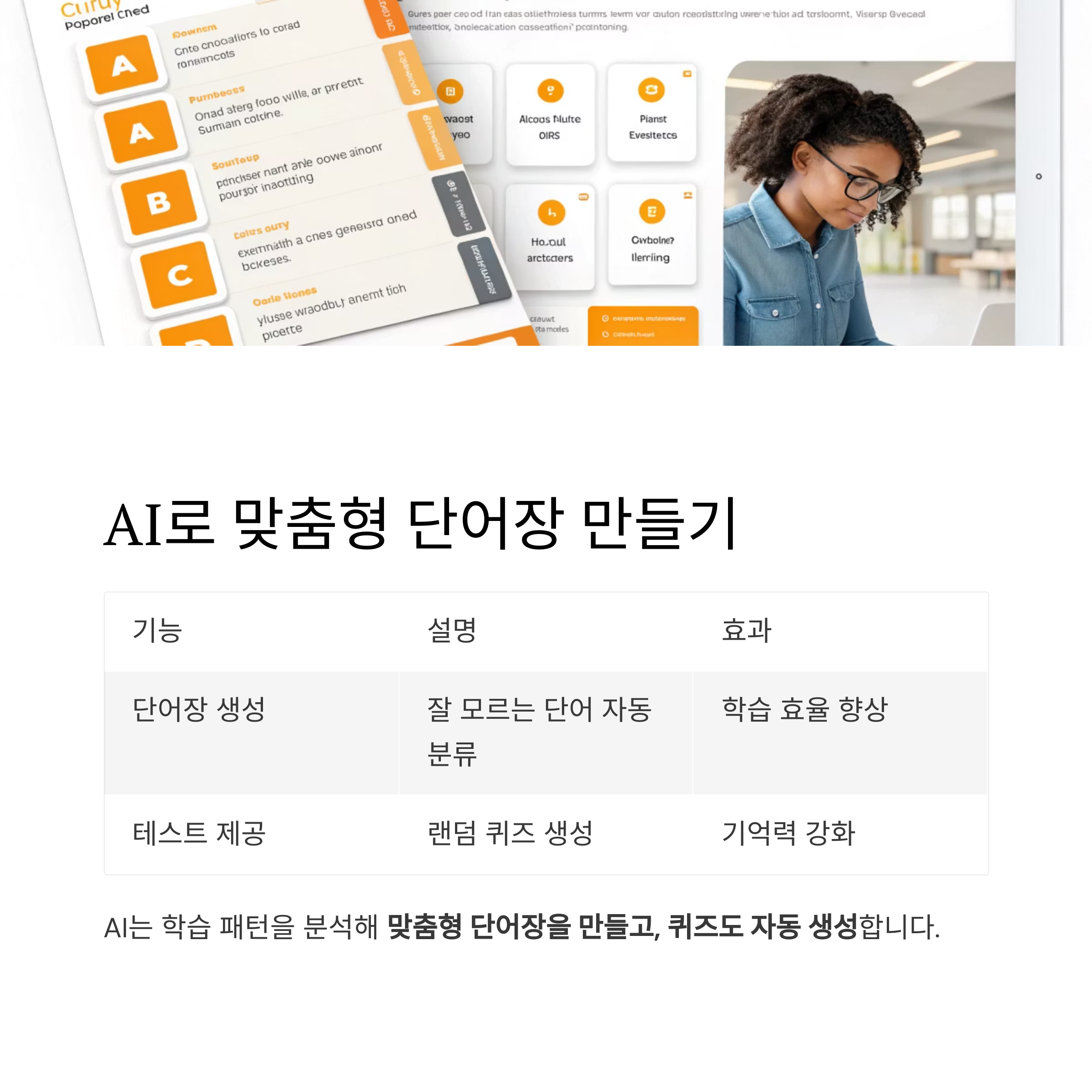 이를 기반으로 맞춤형 단어장을 만들어주고, 퀴즈도 자동 생성됩니다