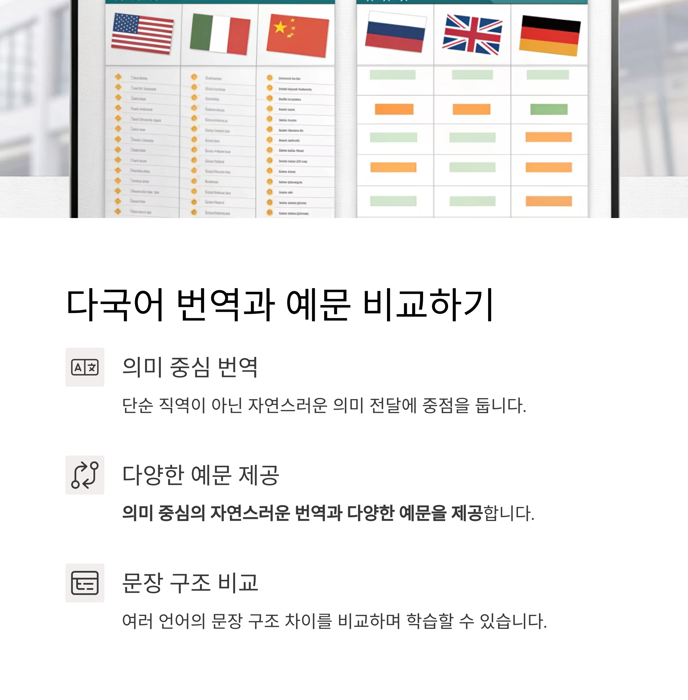 같은 문장을 여러 언어로 번역해보며 문장 구조의 차이도 비교할 수 있어
