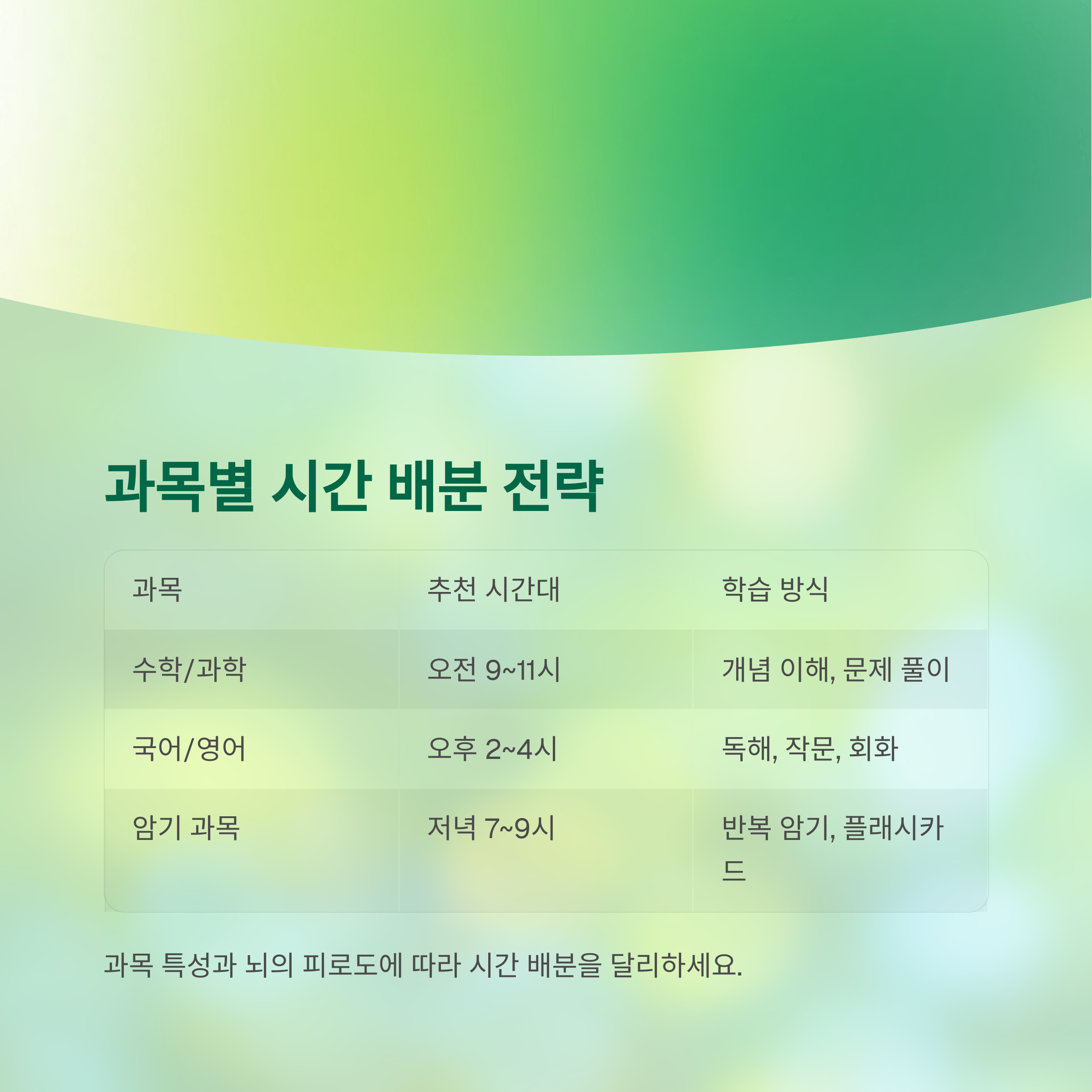 | 암기 과목 | 저녁 7~9시 | 반복 암기, 플래시카드 |