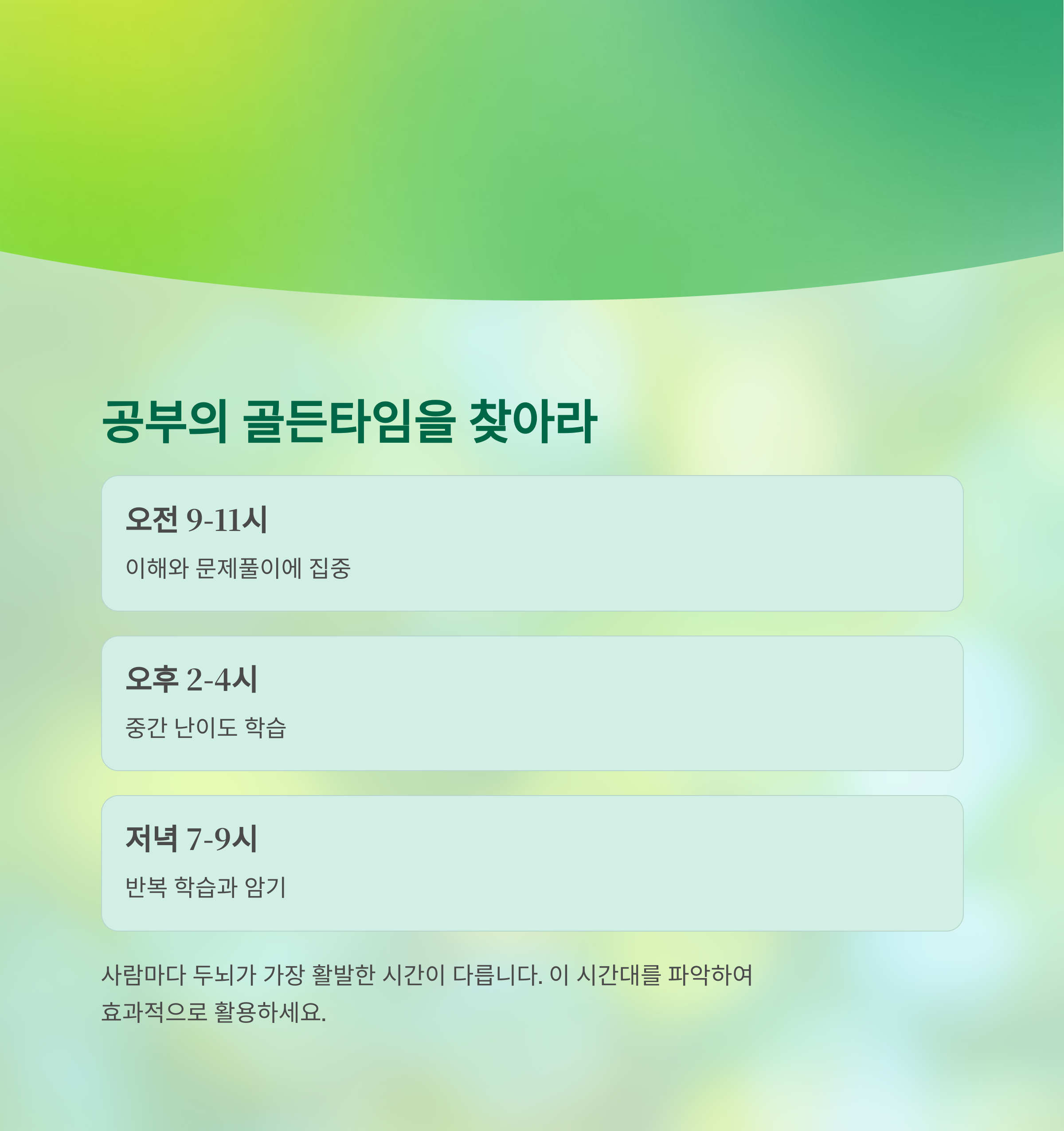반복 학습이나 암기는 상대적으로 집중력이 떨어지는 시간에 배치하는 것이 이상적입니다.