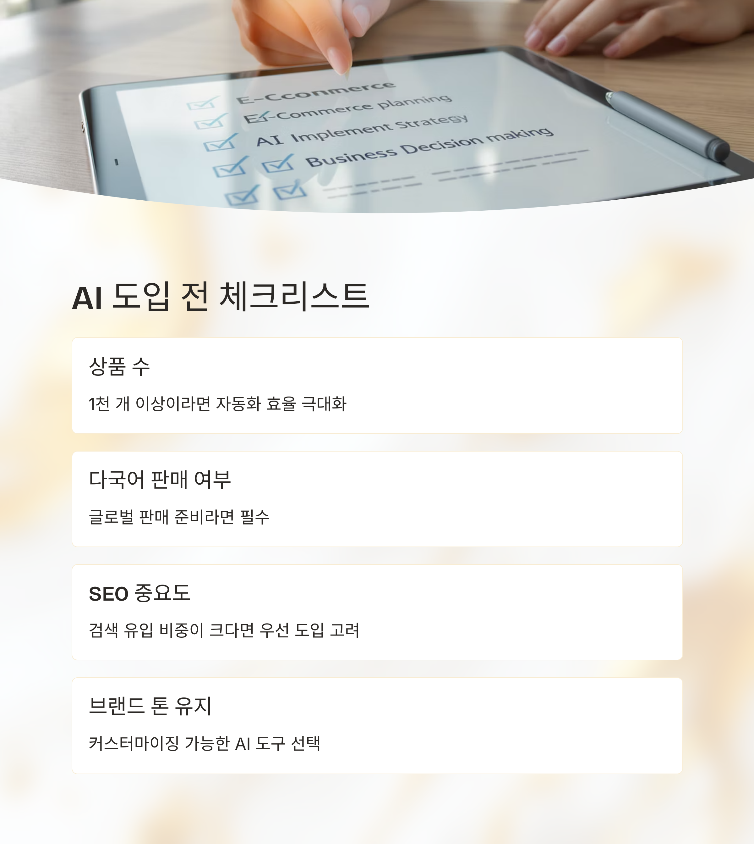 | 상품 수 | 1천 개 이상이라면 자동화 효율 극대화 |