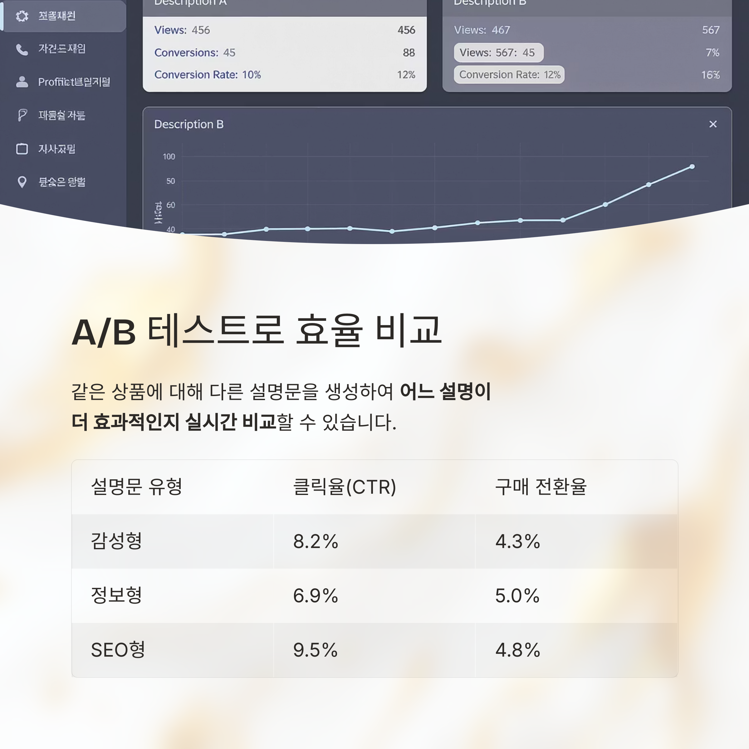 어느 설명이 클릭율과 구매율이 높은지 실시간 비교할 수 있습니다.