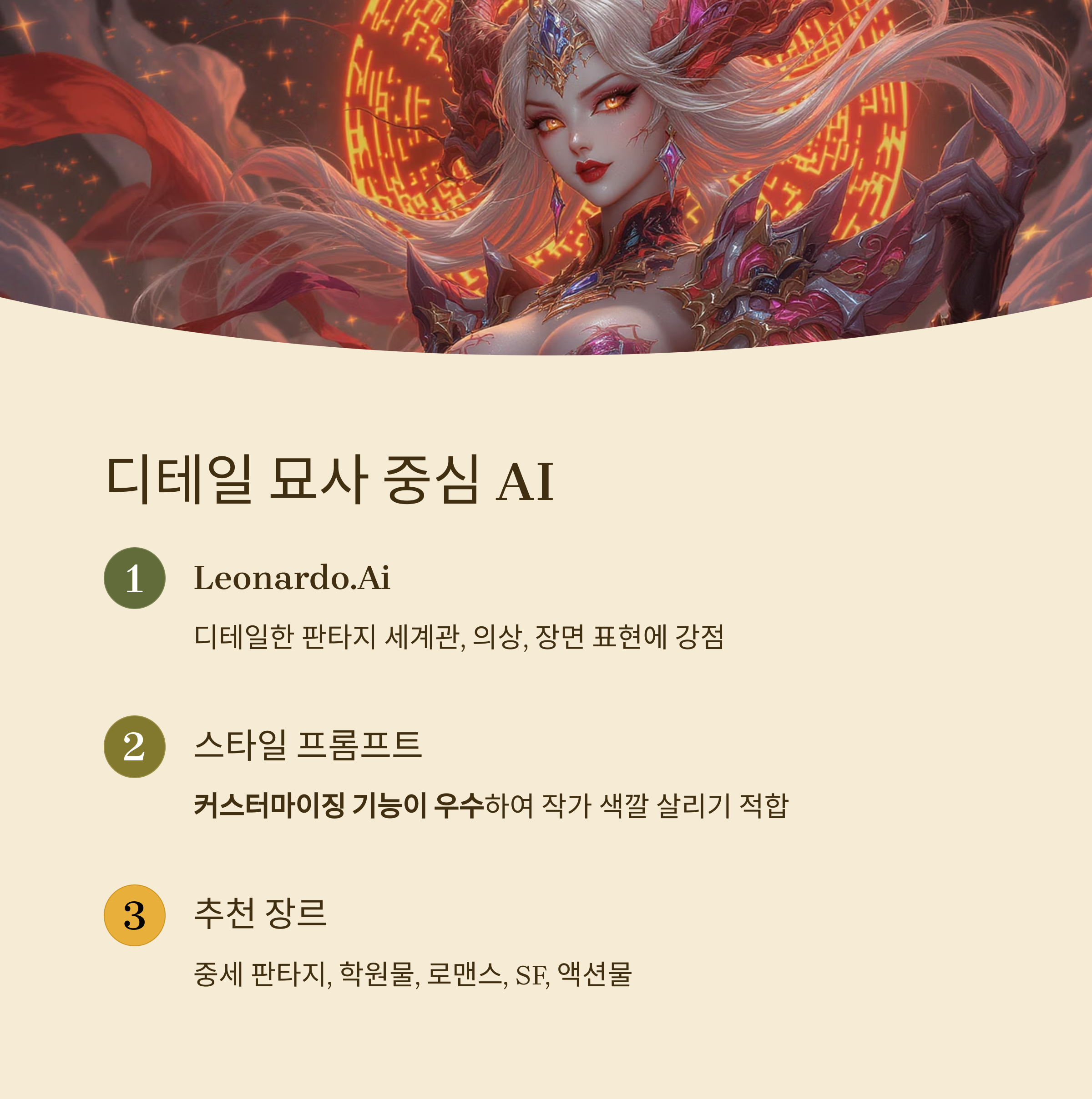 Leonardo.Ai는 디테일한 판타지 세계관, 의상, 장면 표현에 강점을 가진