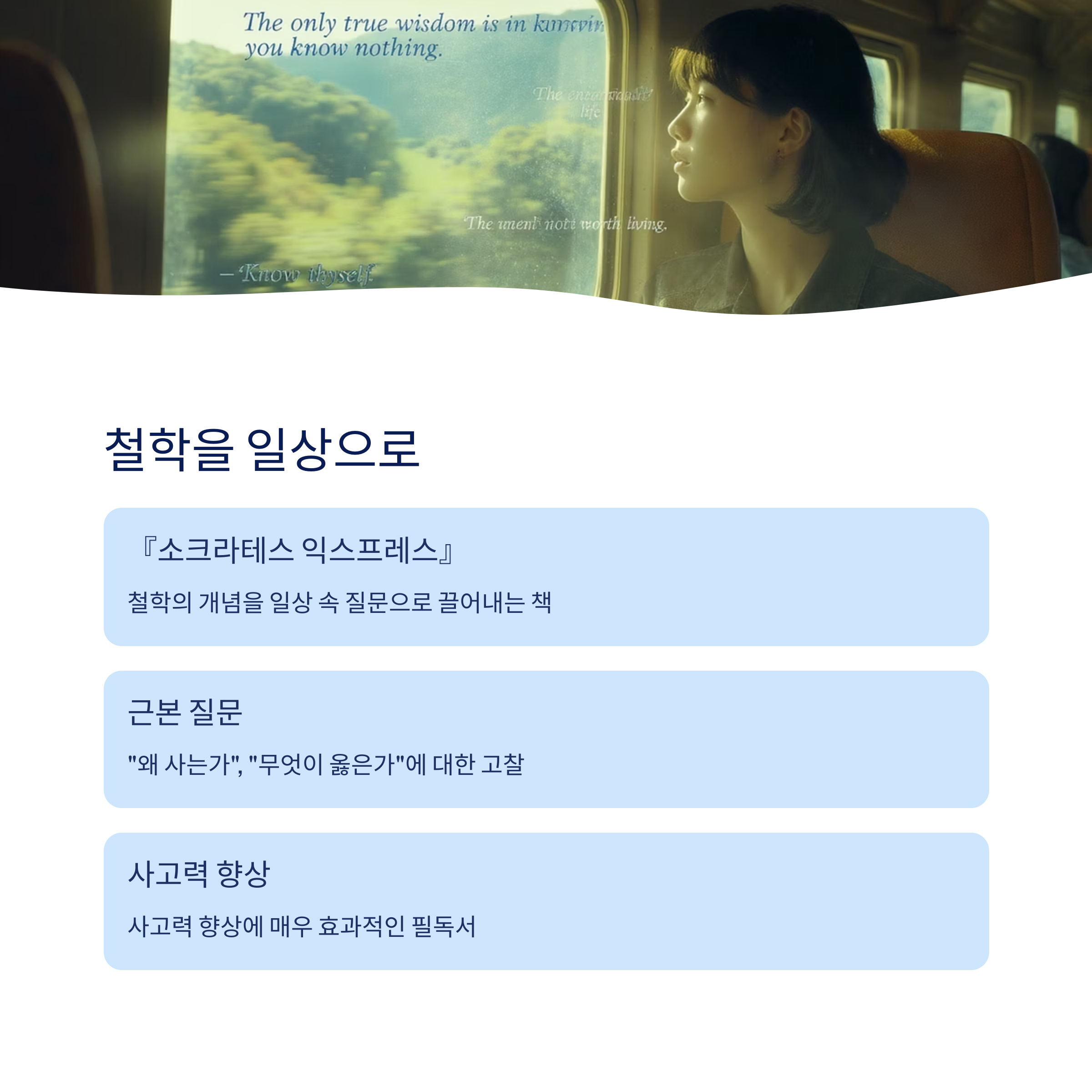 철학의 개념을 일상 속 질문으로 끌어내며 누구나 쉽게 철학을 접할 수 있게 합니다