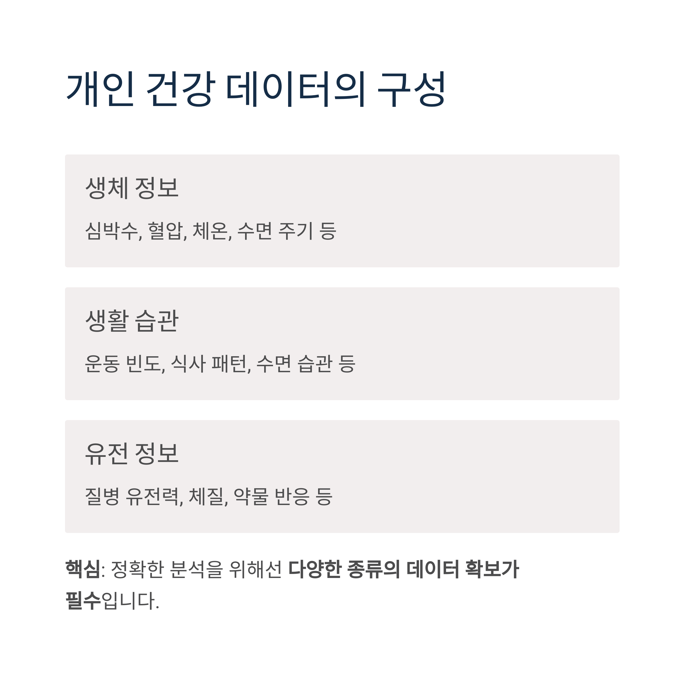 개인 건강 데이터는 매우 다양하며, 다음과 같은 요소들이 포함됩니다