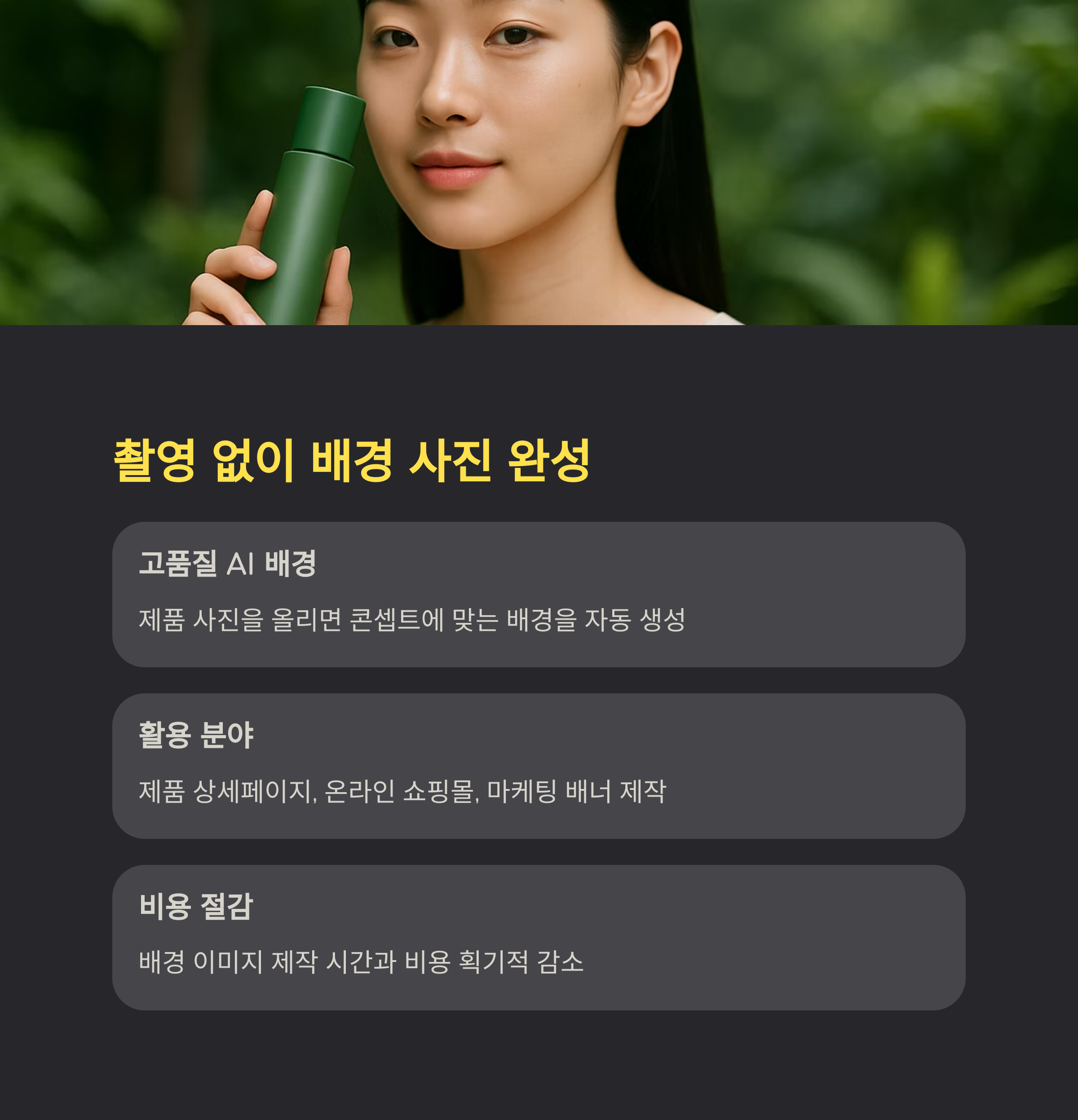 예: 초록색 화장품을 업로드하면, 자연 친화적이면서 색상이 조화로운 배경을 자동으로 구성해줍니다