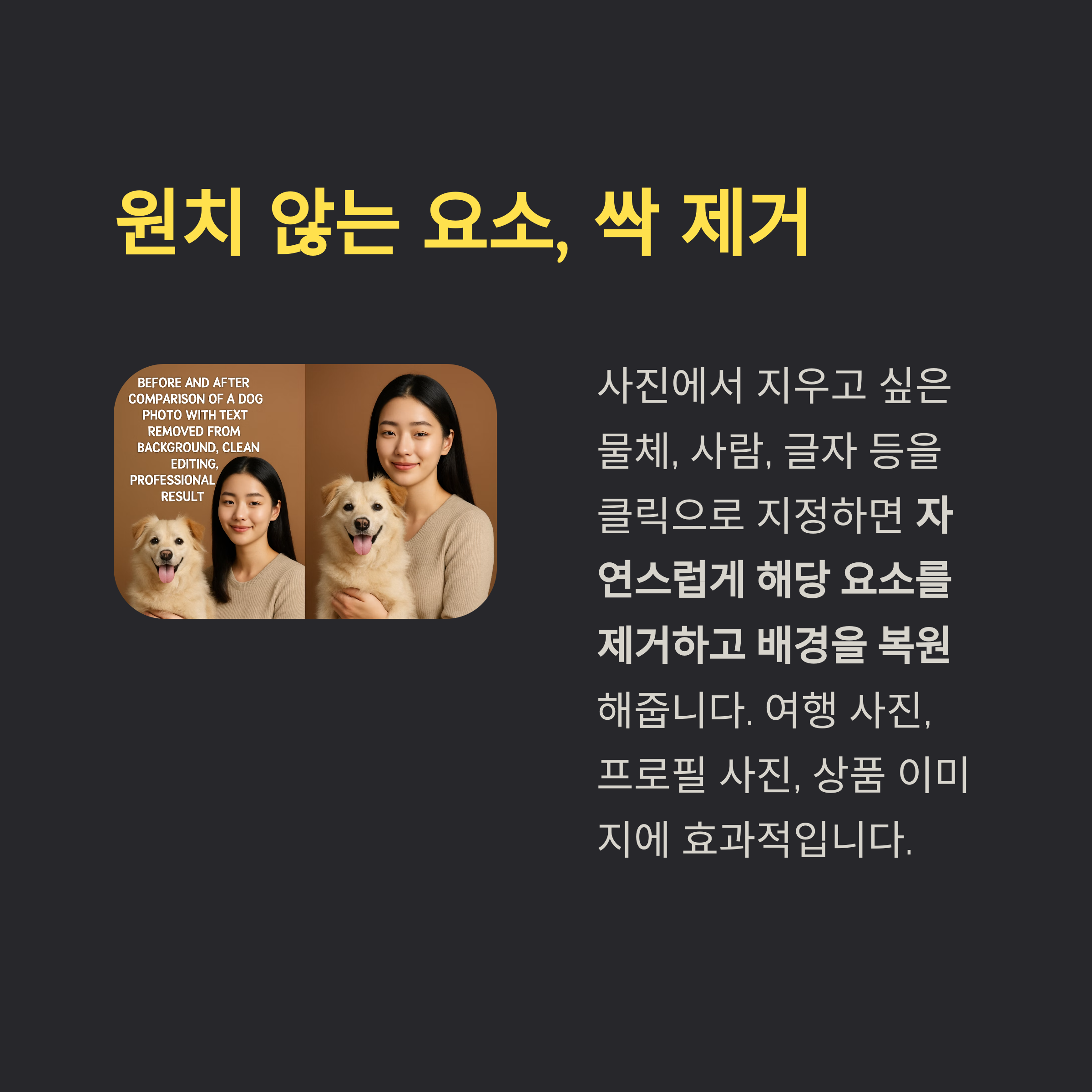 예: 강아지 사진에서 배경 텍스트를 지우면, 반으로 나뉜 이미지처럼