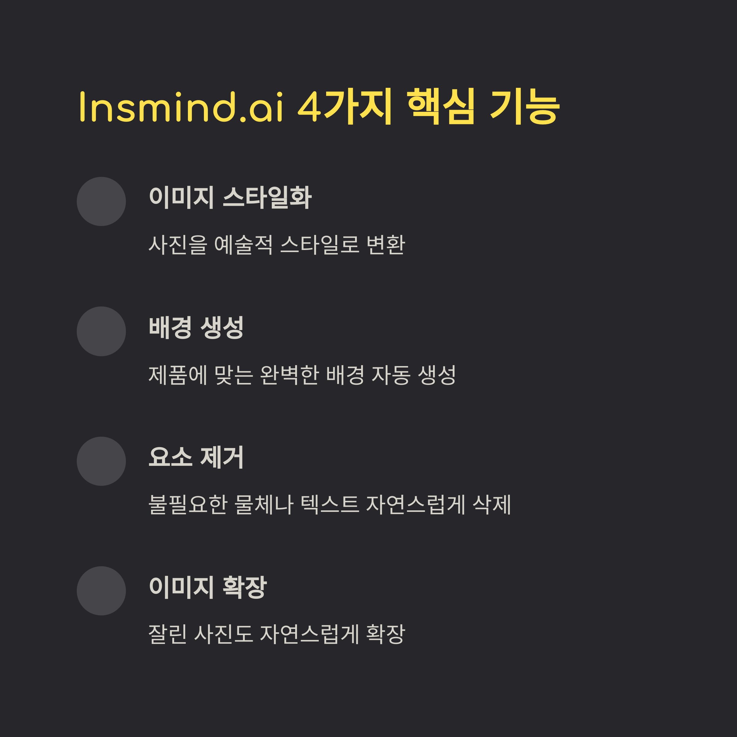 Insmind.ai는 이미지 작업에 특화된 4가지 핵심 AI 기능을 제공합니다