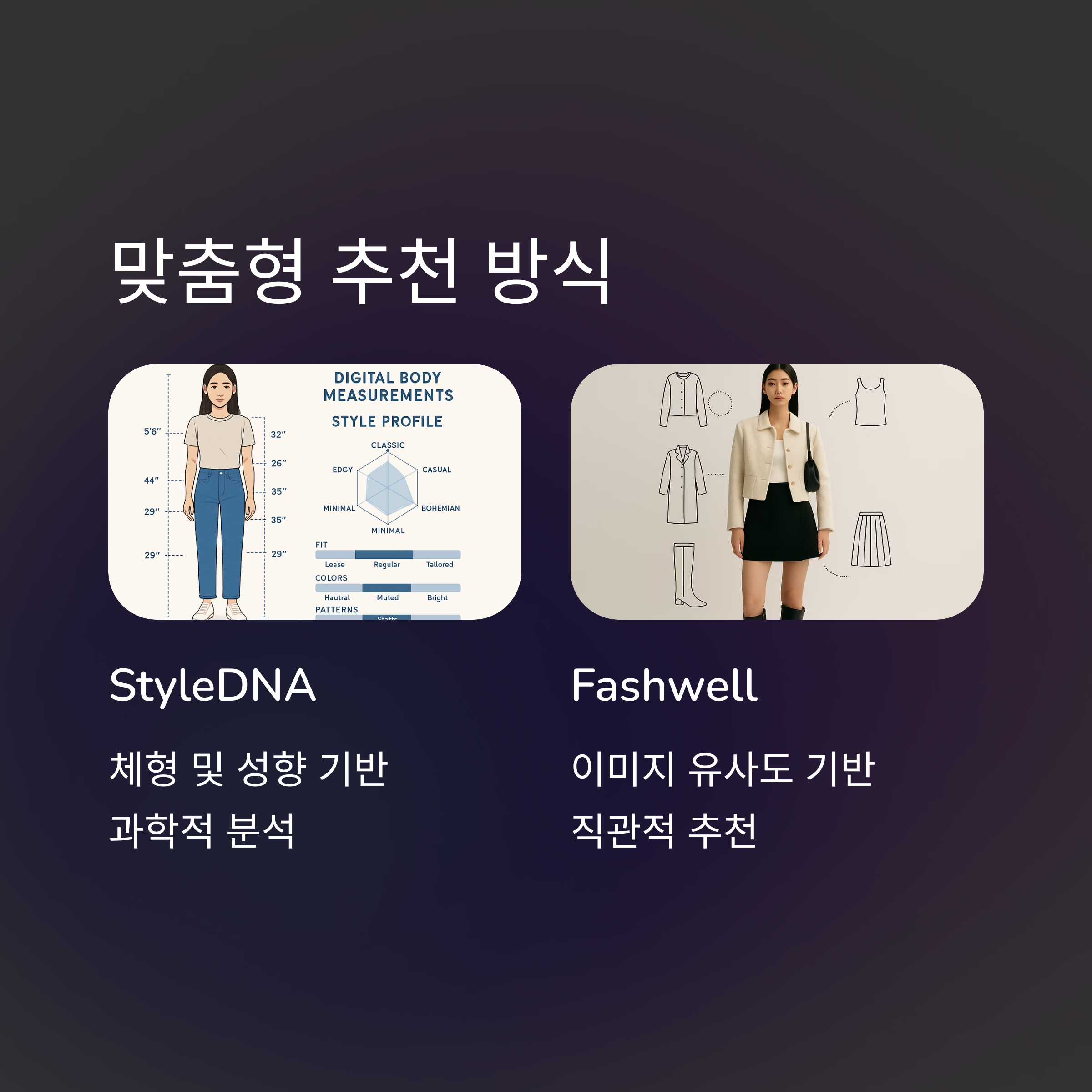 | Fashwell | 이미지 유사도 기반 | 시각적 직관 중심 |