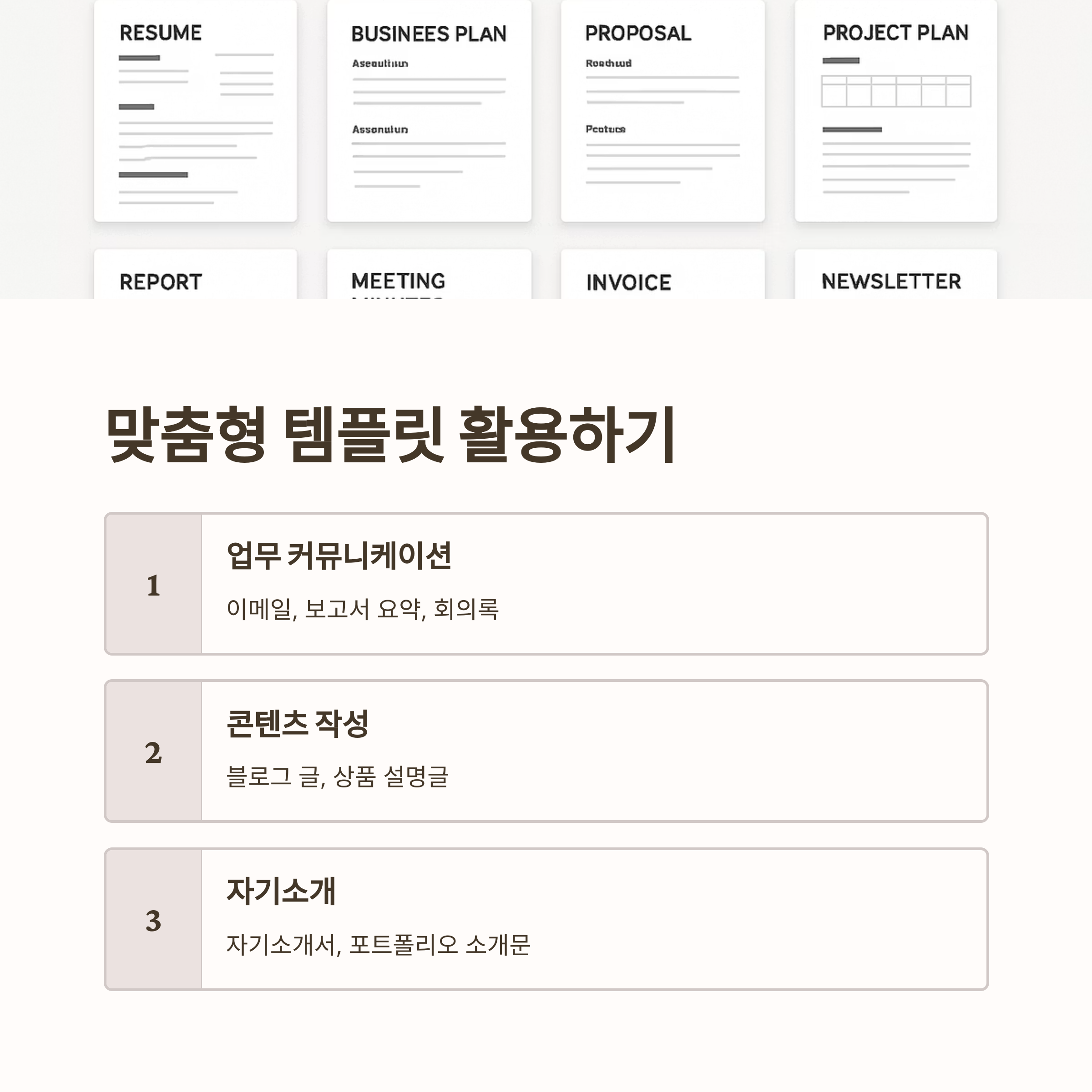 자기소개서, 보고서, 회의 안건, 마케팅 문구