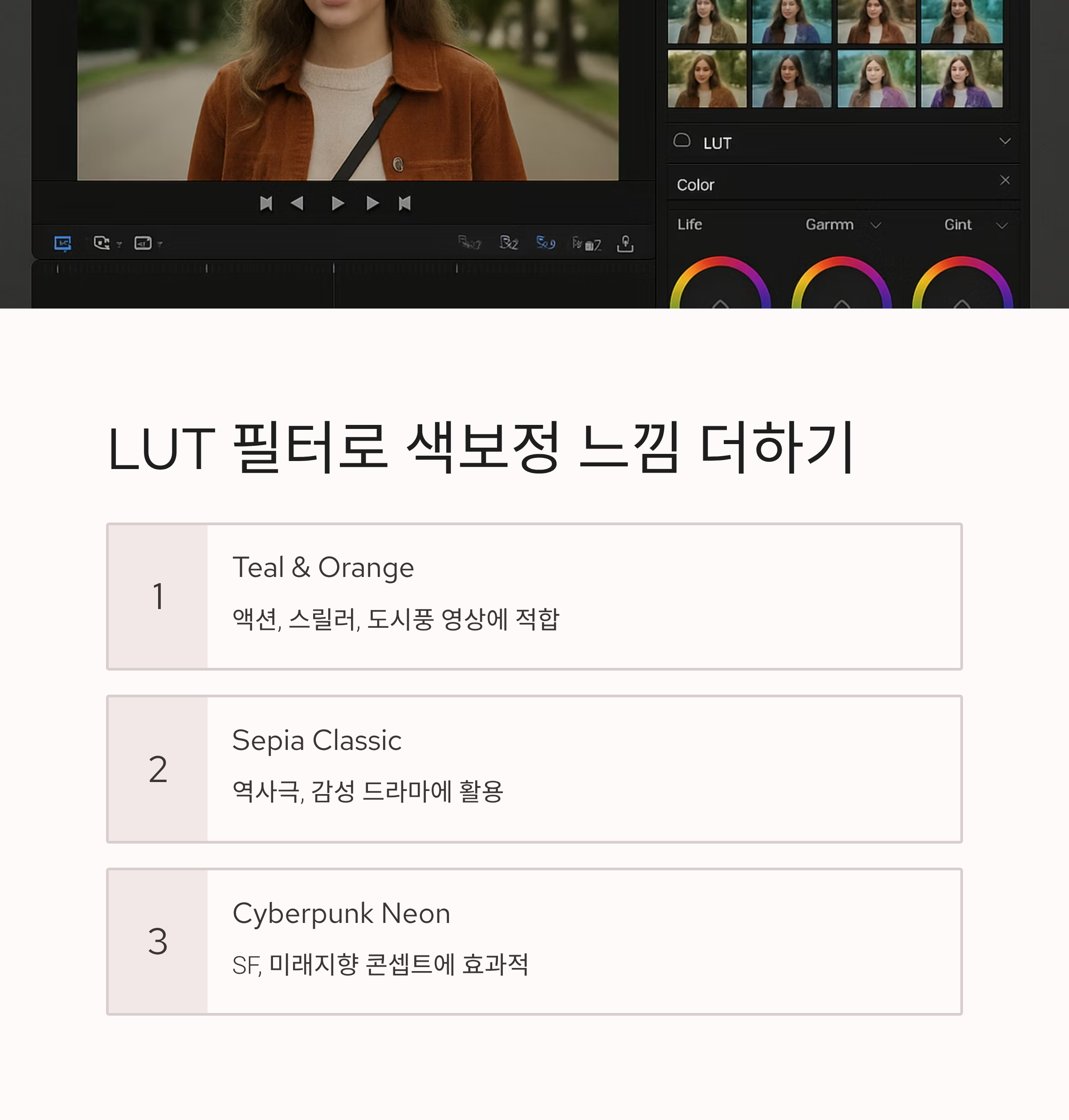| LUT 스타일 | 추천 활용 영상 장르 |