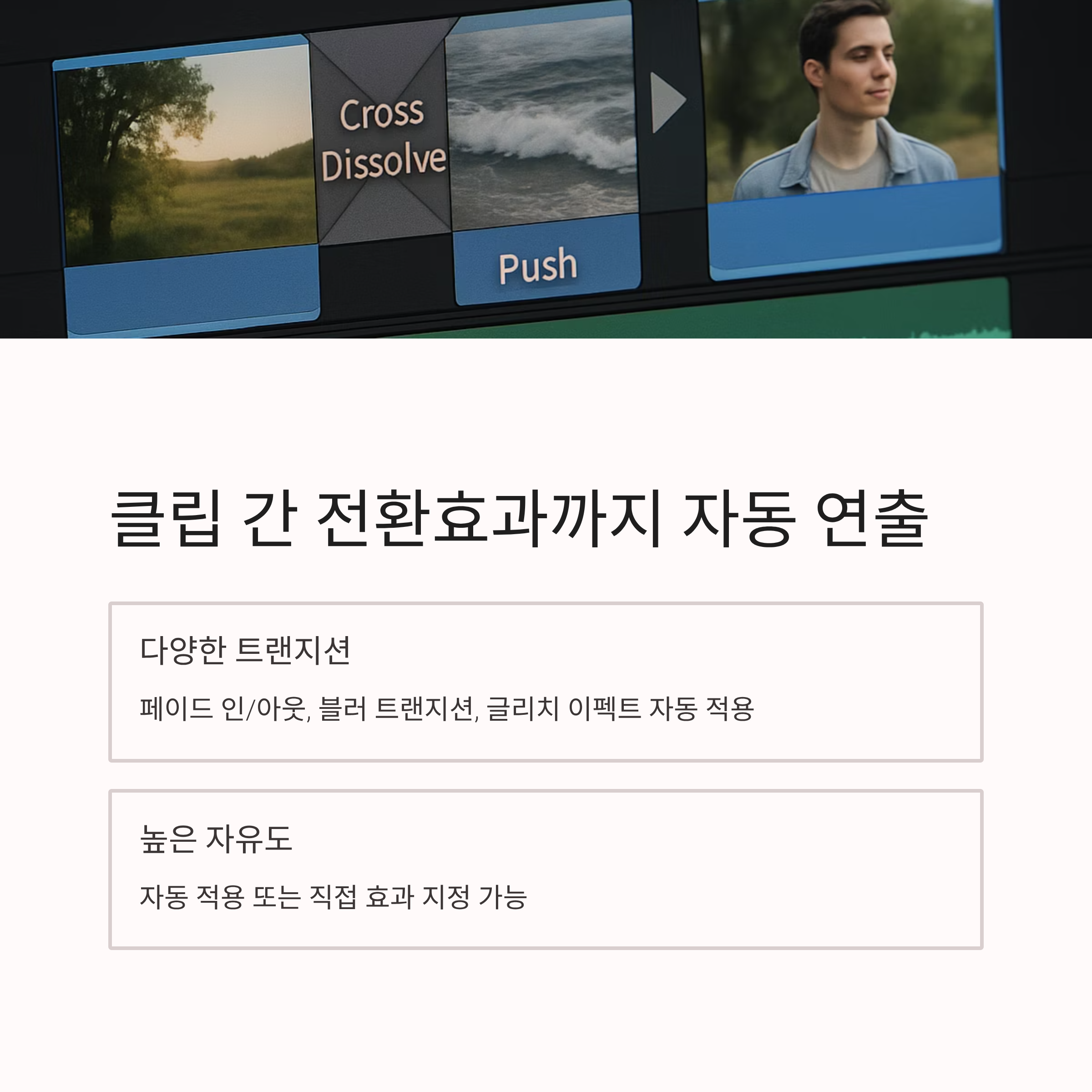 페이드 인/아웃, 블러 트랜지션, 글리치 이펙트 등을 활용하면
