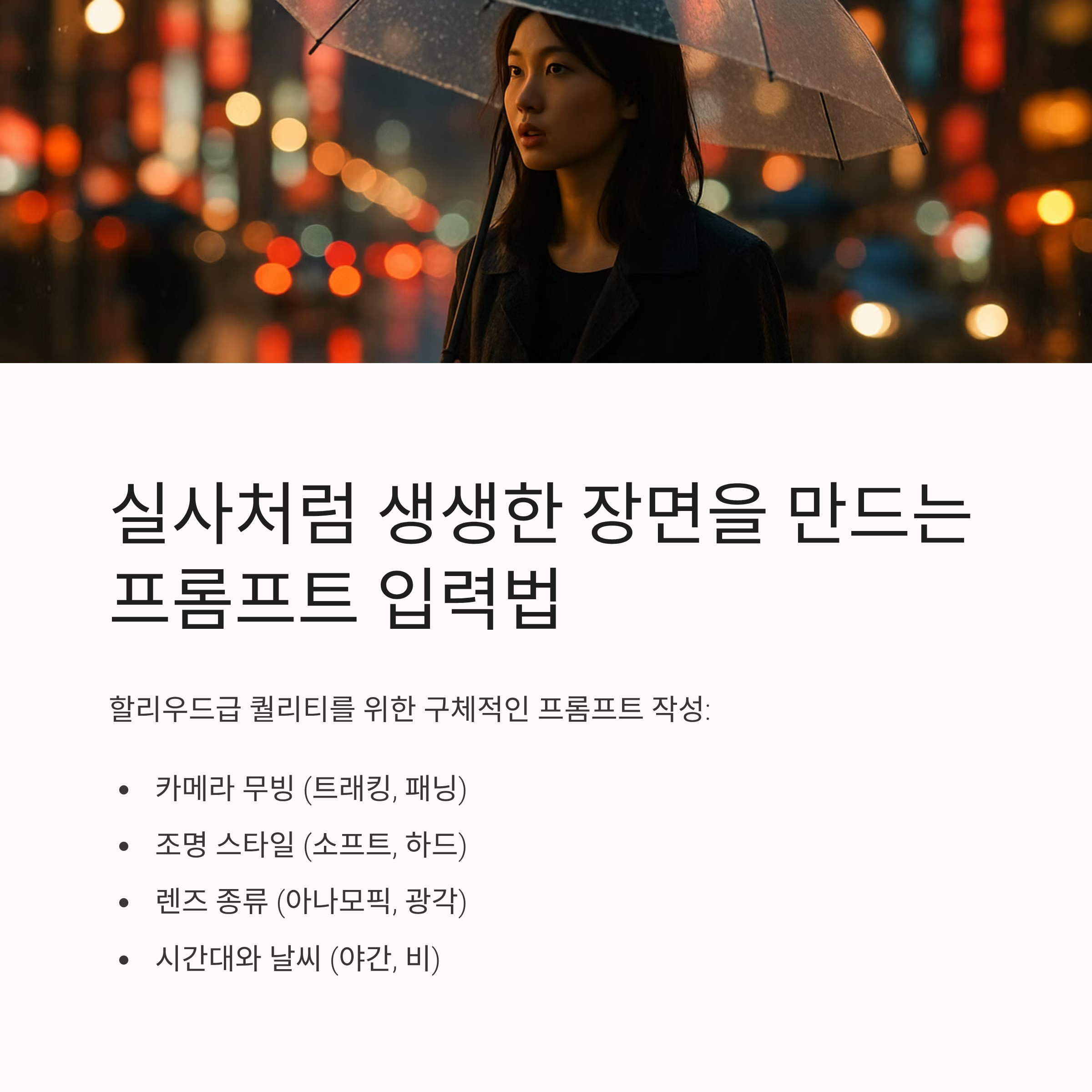카메라 무빙, 조명, 렌즈 종류, 시간대 같은 요소를 구체적으로 써야 합니다.
