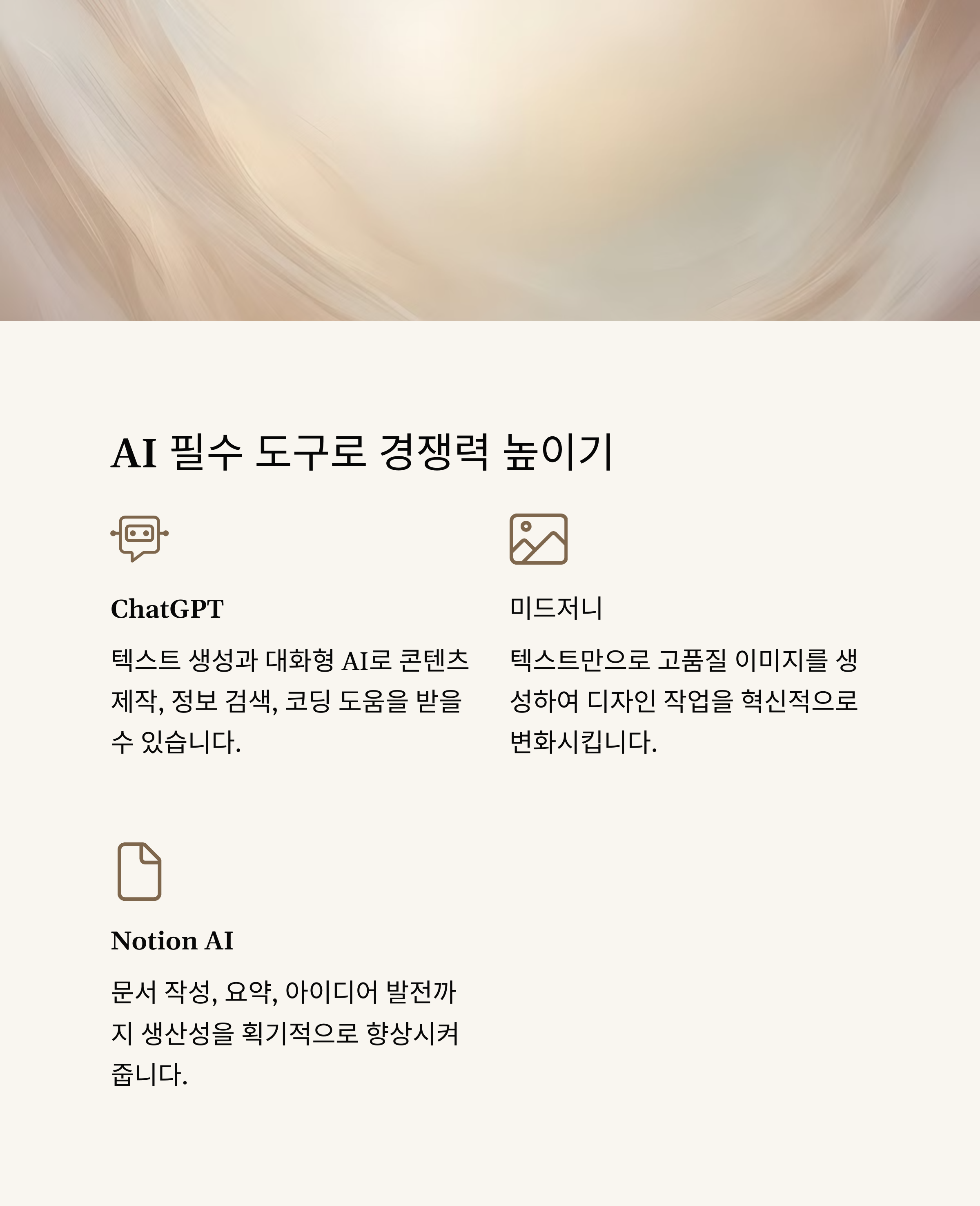 ChatGPT 같은 접근성이 좋은 콘텐츠 생성 도구부터 시작하면 쉽고 빠르게 AI에 익숙해질 수 있어요.