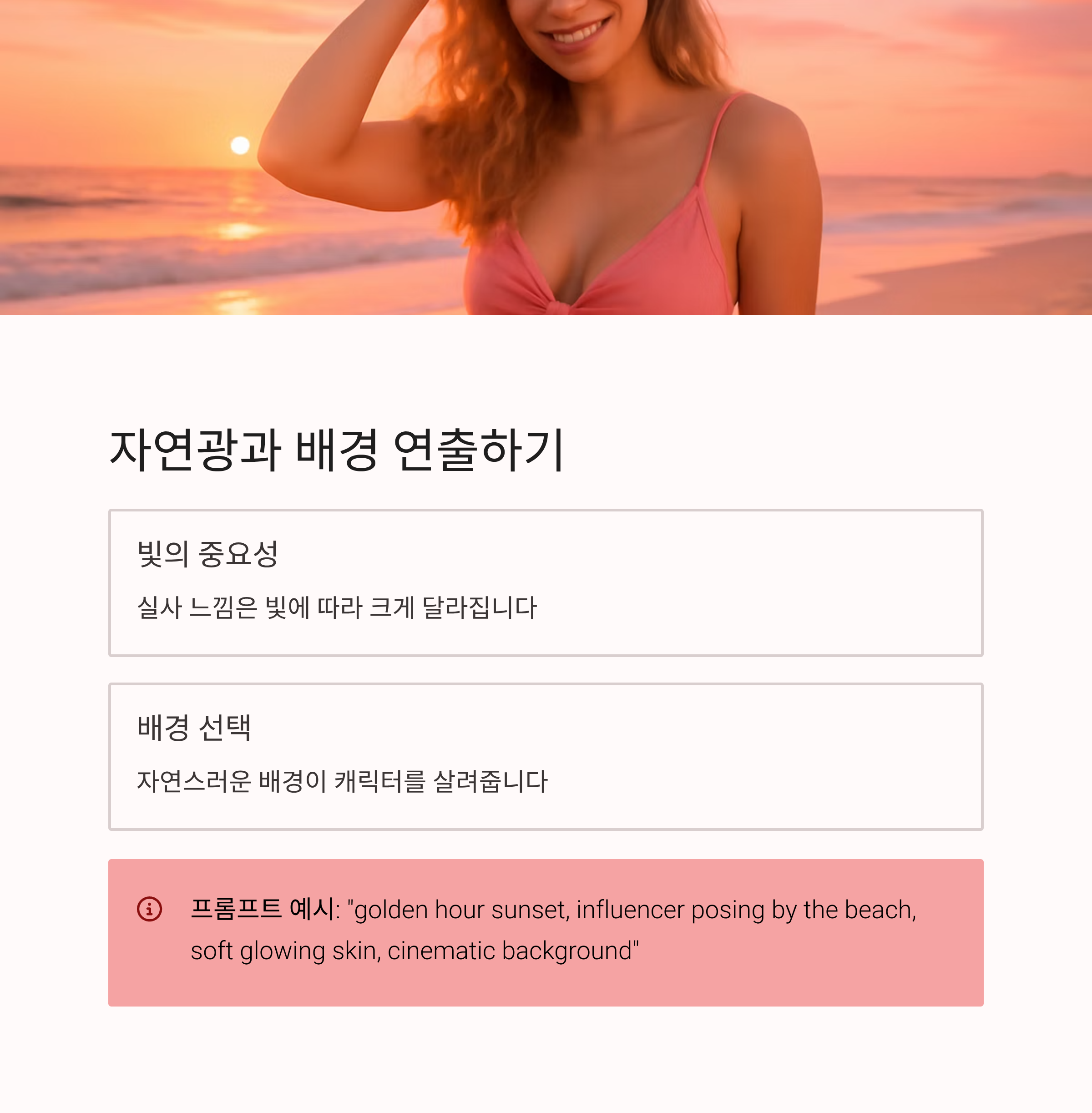 프롬프트 예시: "golden hour sunset, influencer posing by the beach,