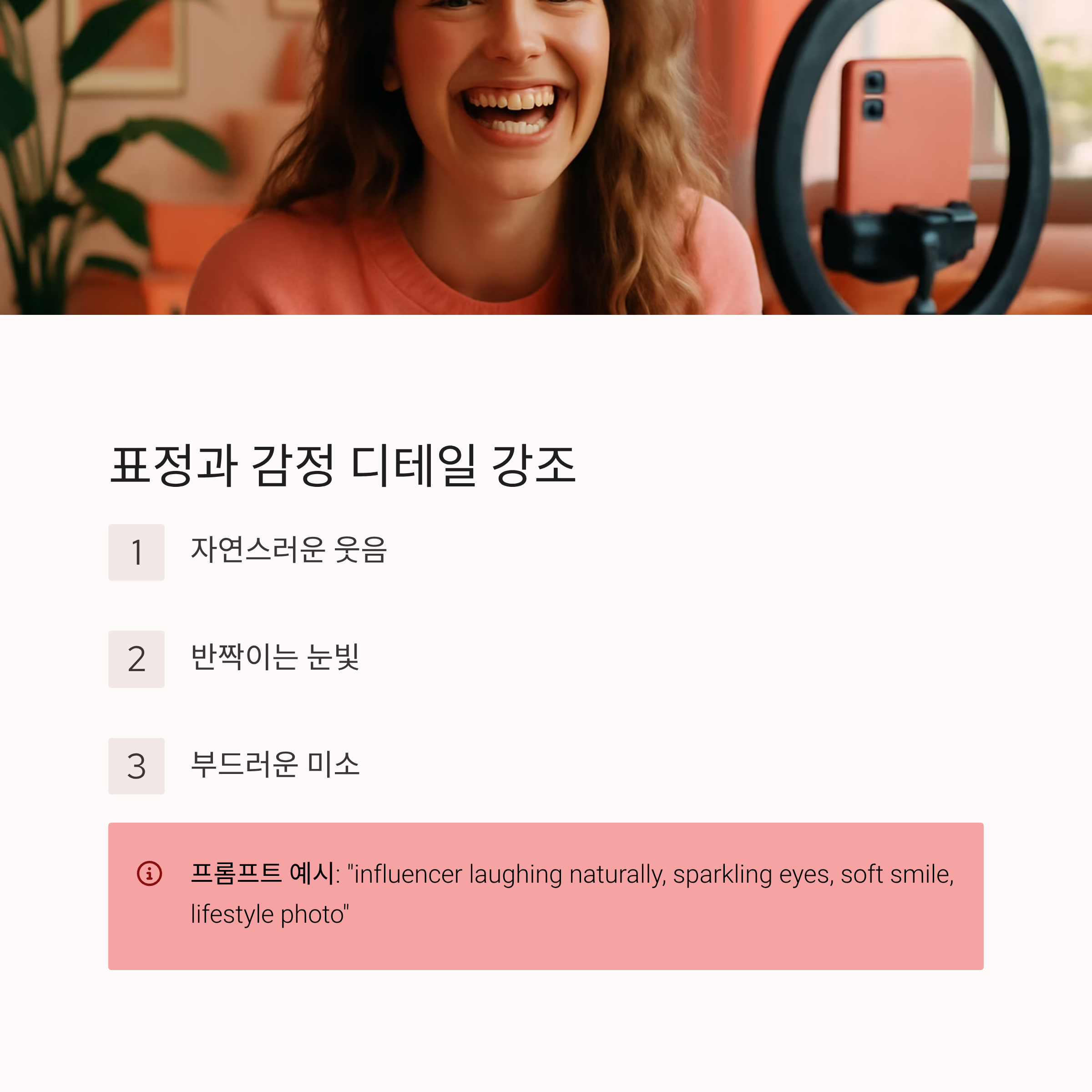 프롬프트 예시: "influencer laughing naturally, sparkling eyes,