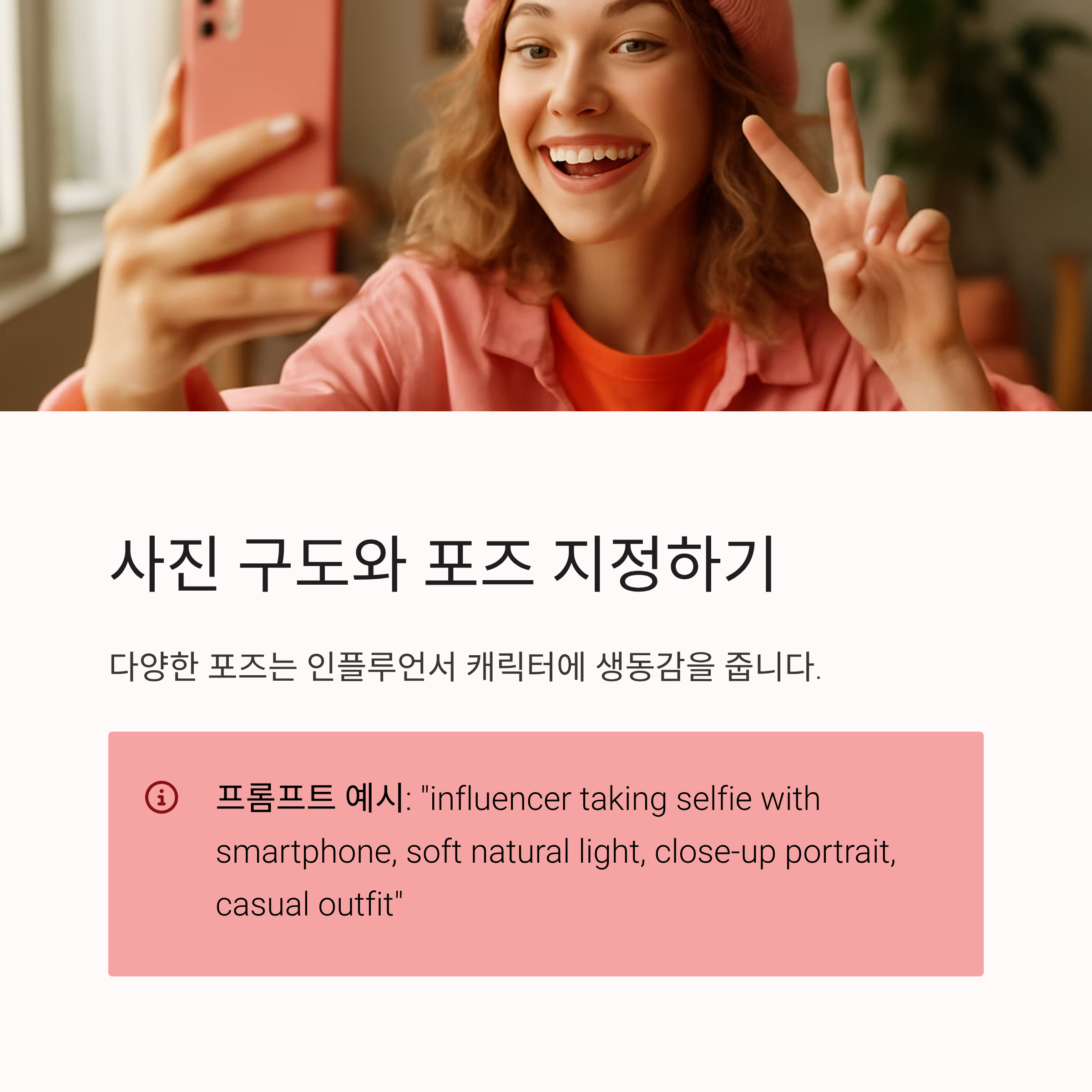 프롬프트 예시: "influencer taking selfie with smartphone, soft natural light,