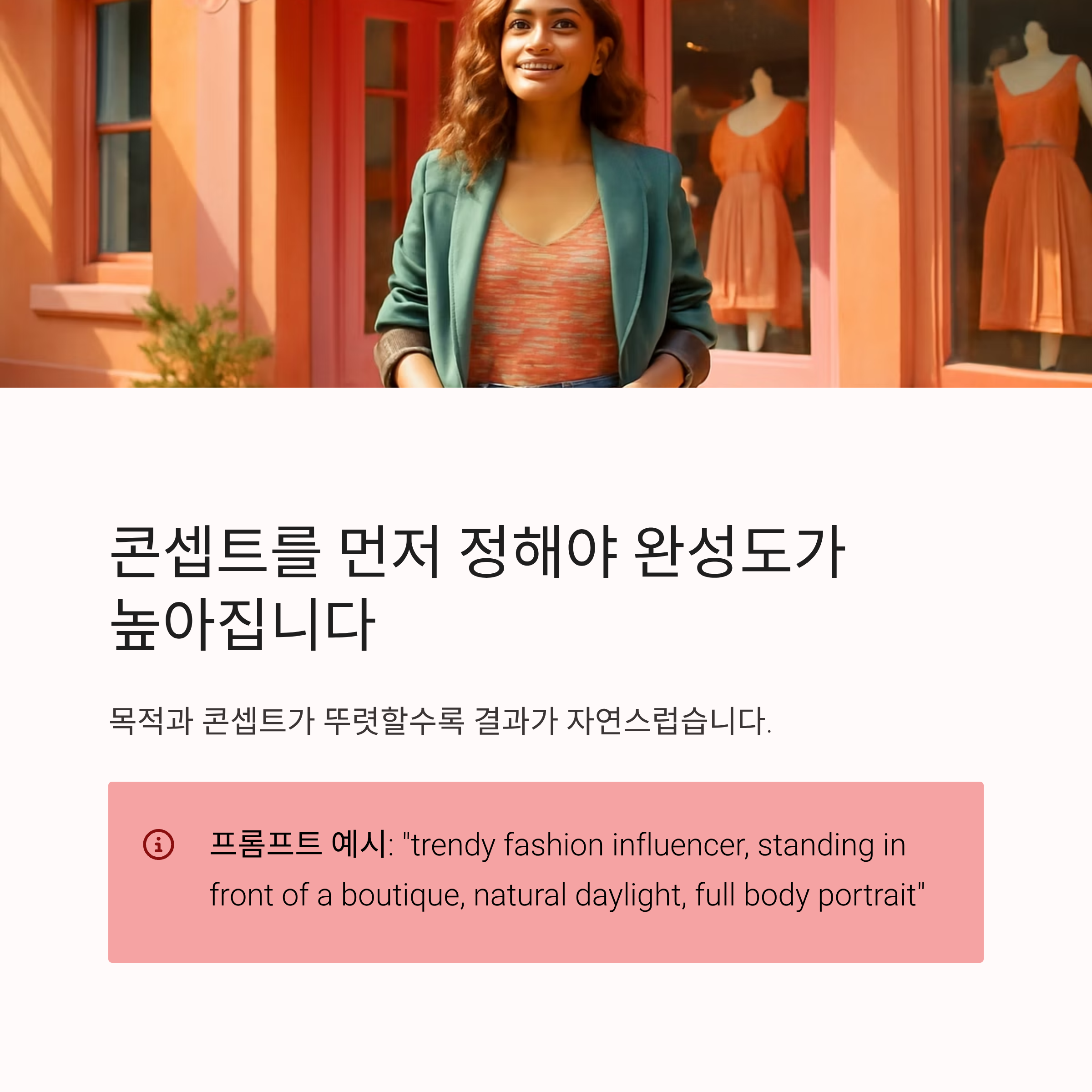 프롬프트 예시: "trendy fashion influencer, standing in front of a boutique,