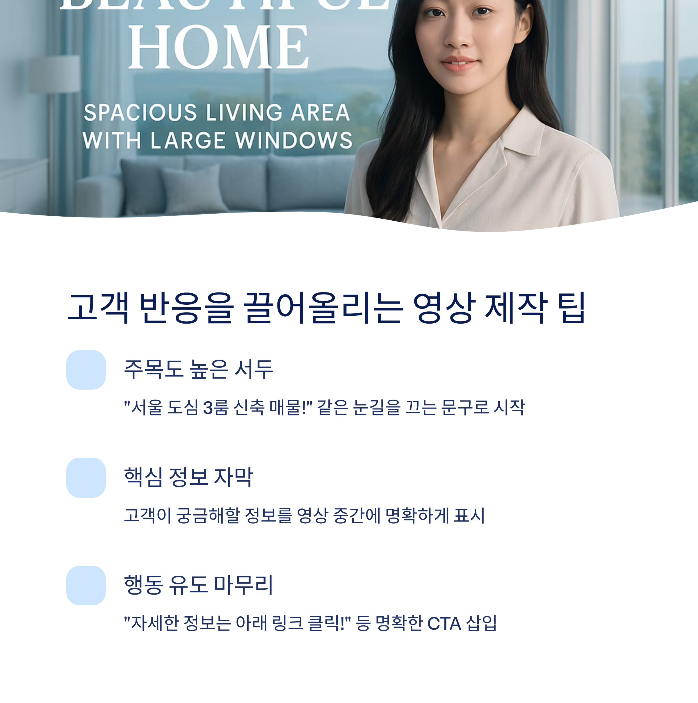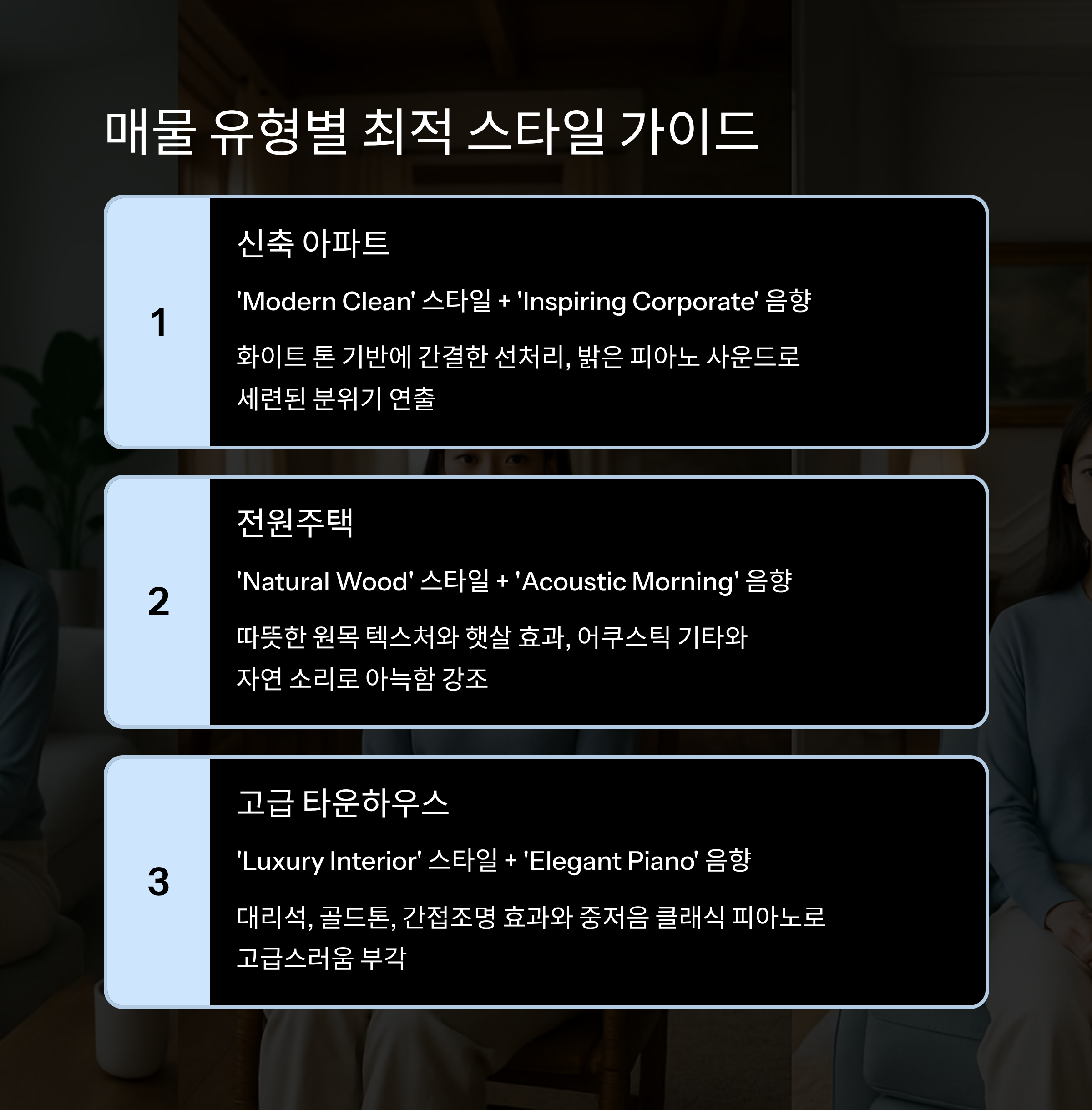 스타일·음향까지 완벽 반영된 매물 소개로 클릭률과 문의 전환율을 동시에 높일 수 있습니다.
