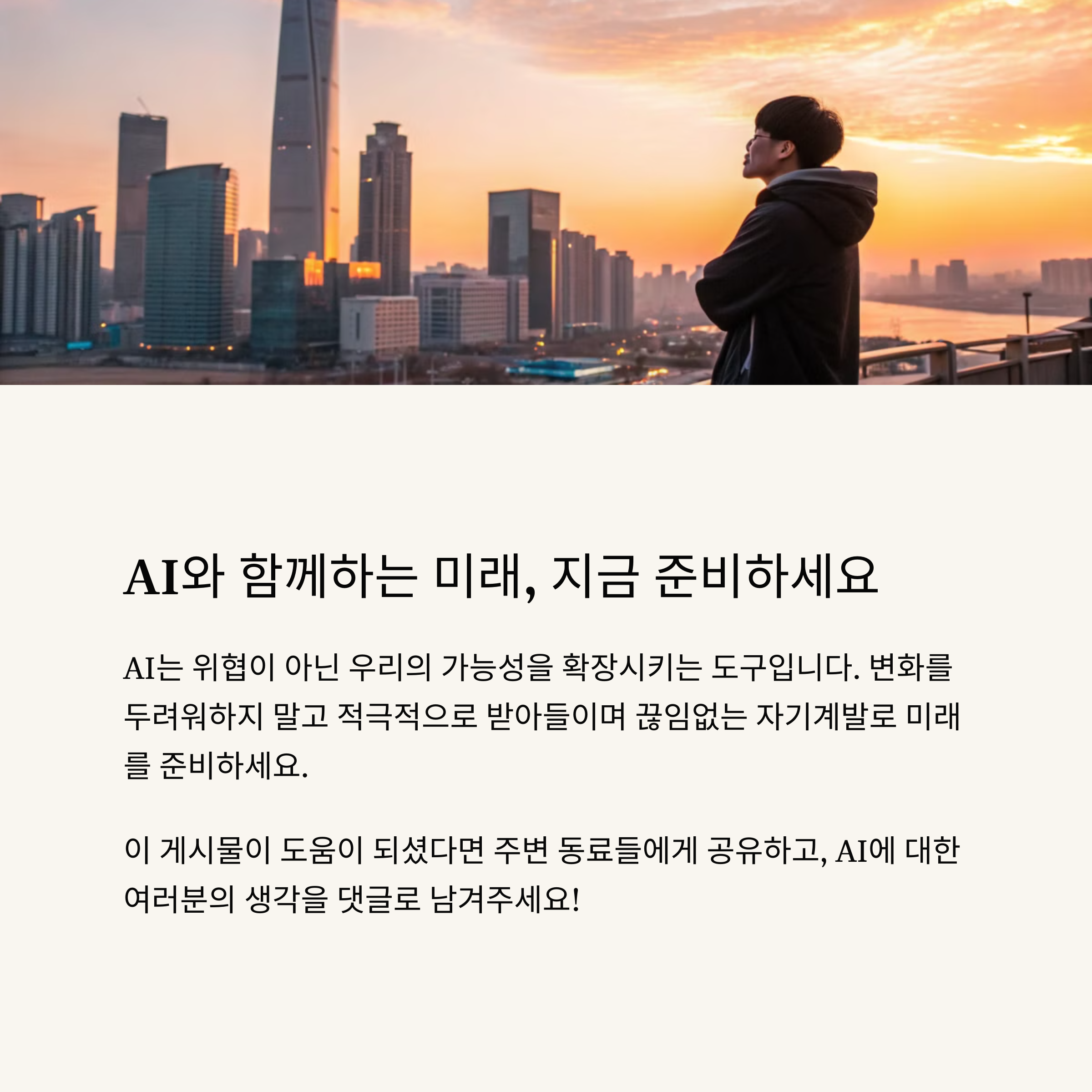 지금까지 AI가 가져올 변화와 꼭 배워야 할 도구들에 대해 이야기해봤는데 어떠셨나요? 기술의 발전은 막을 수 없지만, 준비하는 사람에게는 분명 기회가 될 거예요. 여러분의 생각이나 경험도 댓글로 공유해주세요. 함께 미래를 대비해 봐요!
