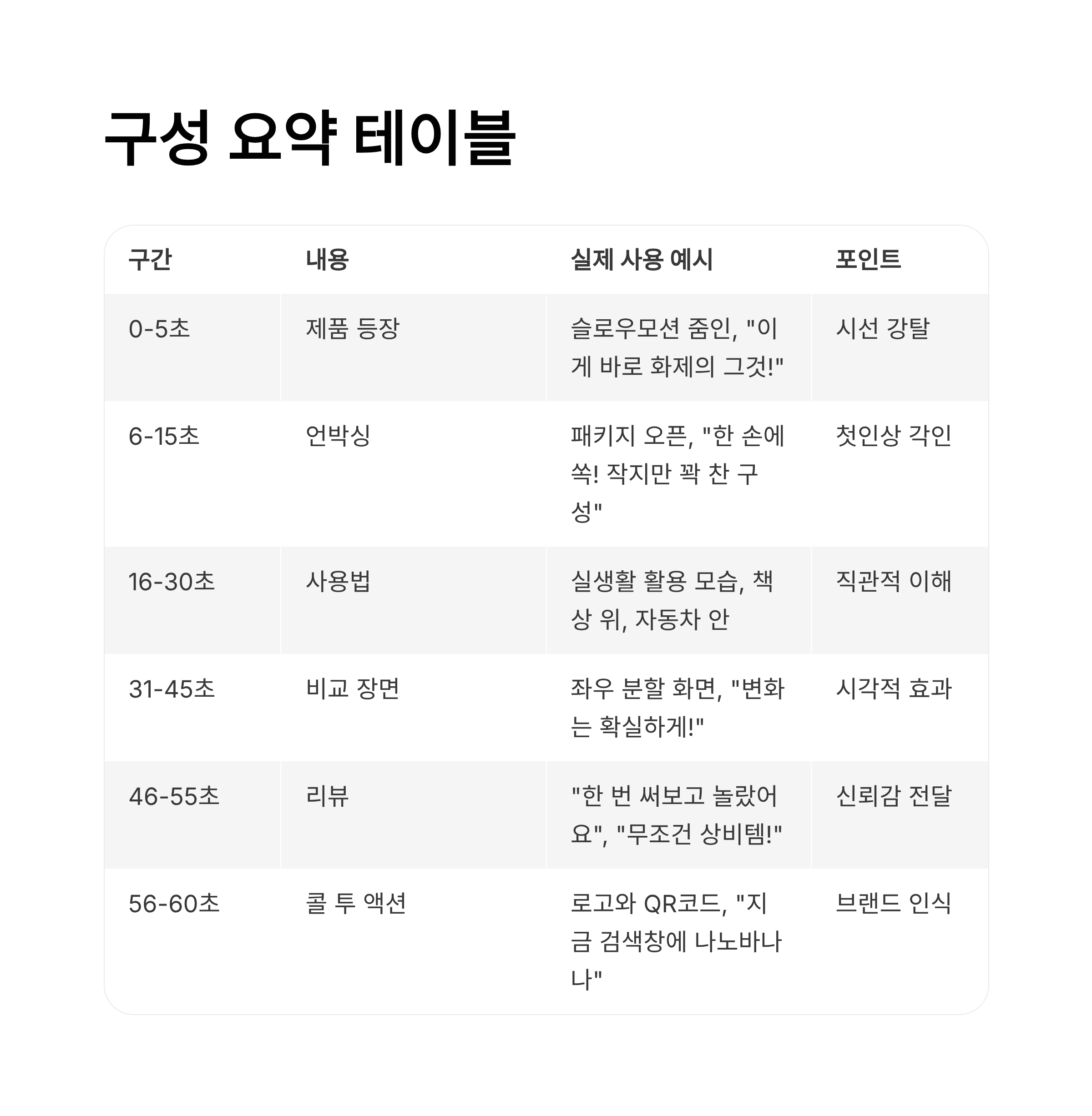 | 46~55초 | 리뷰 | 실사용자들이 핸드폰 셀카처럼 짧게 말하는 영상 리뷰 또는 자막 예: “한 번 써보고 놀랐어요”, “지금은 무조건 상비템!” | 신뢰감 전달 |