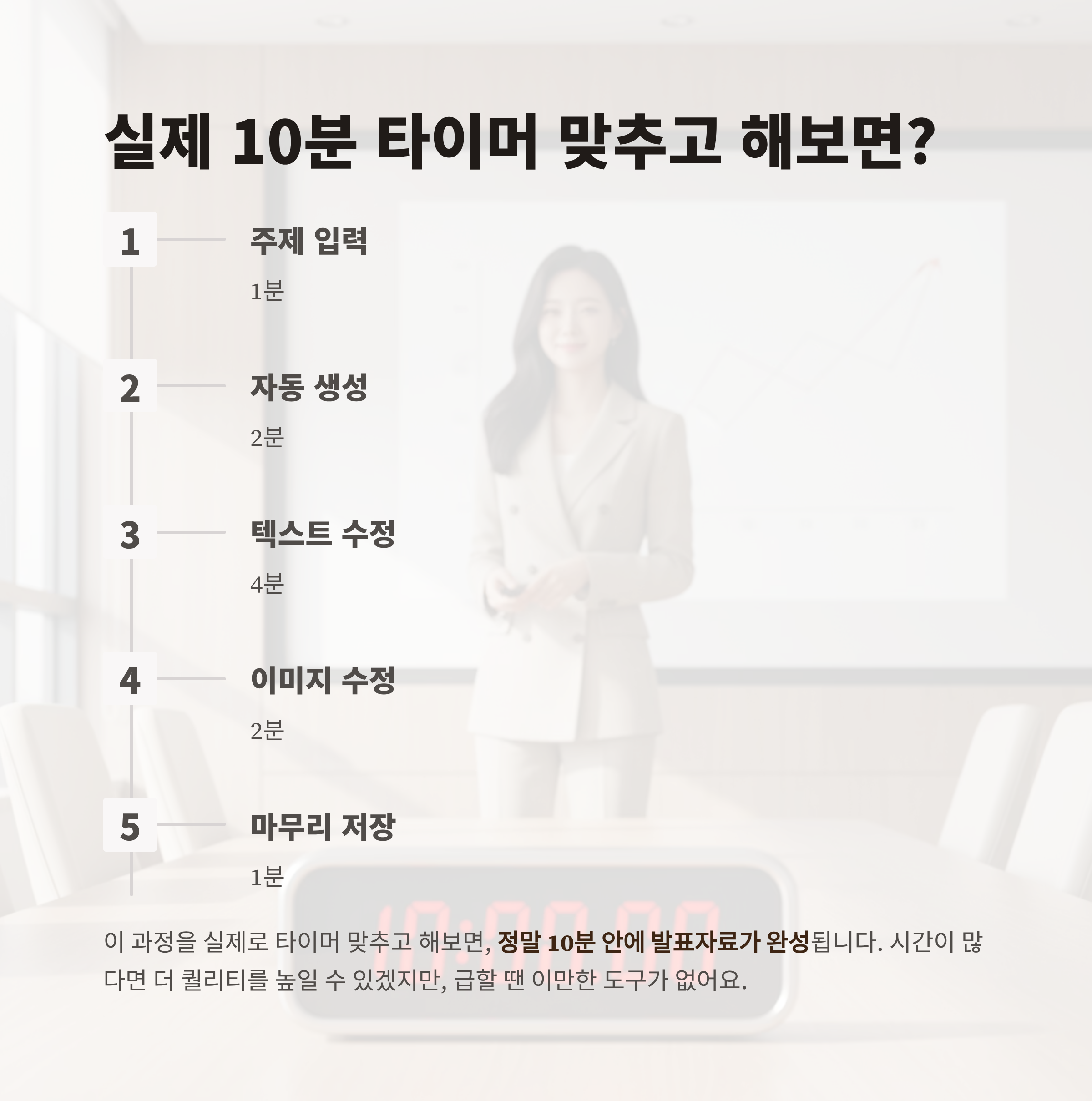 이 과정을 실제로 타이머 맞추고 해보면, 정말 10분 안에 발표자료가 완성됩니다.