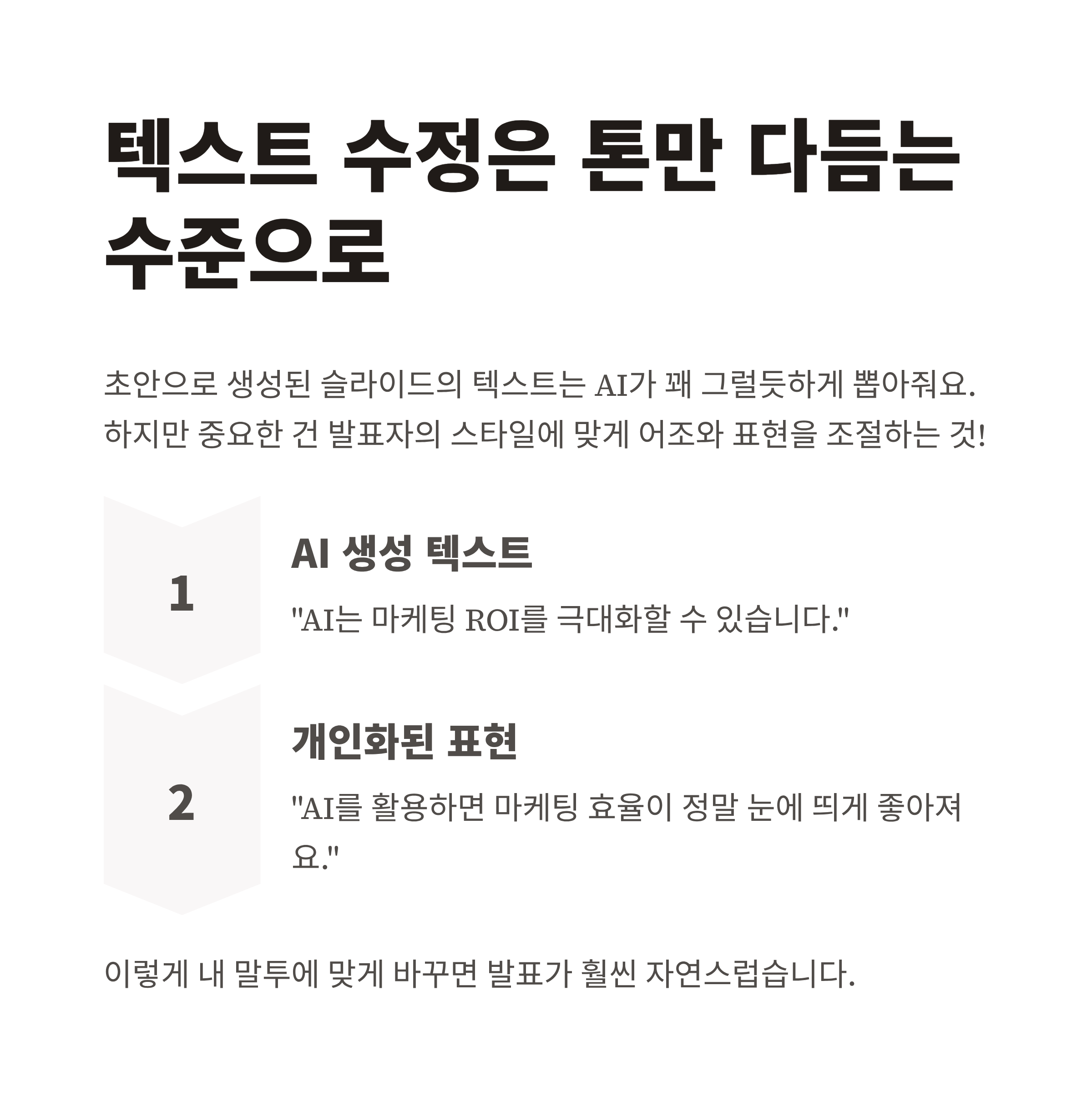 "AI는 마케팅 ROI를 극대화할 수 있습니다." → "AI를 활용하면 마케팅 효율이 정말 눈에 띄게 좋아져요."