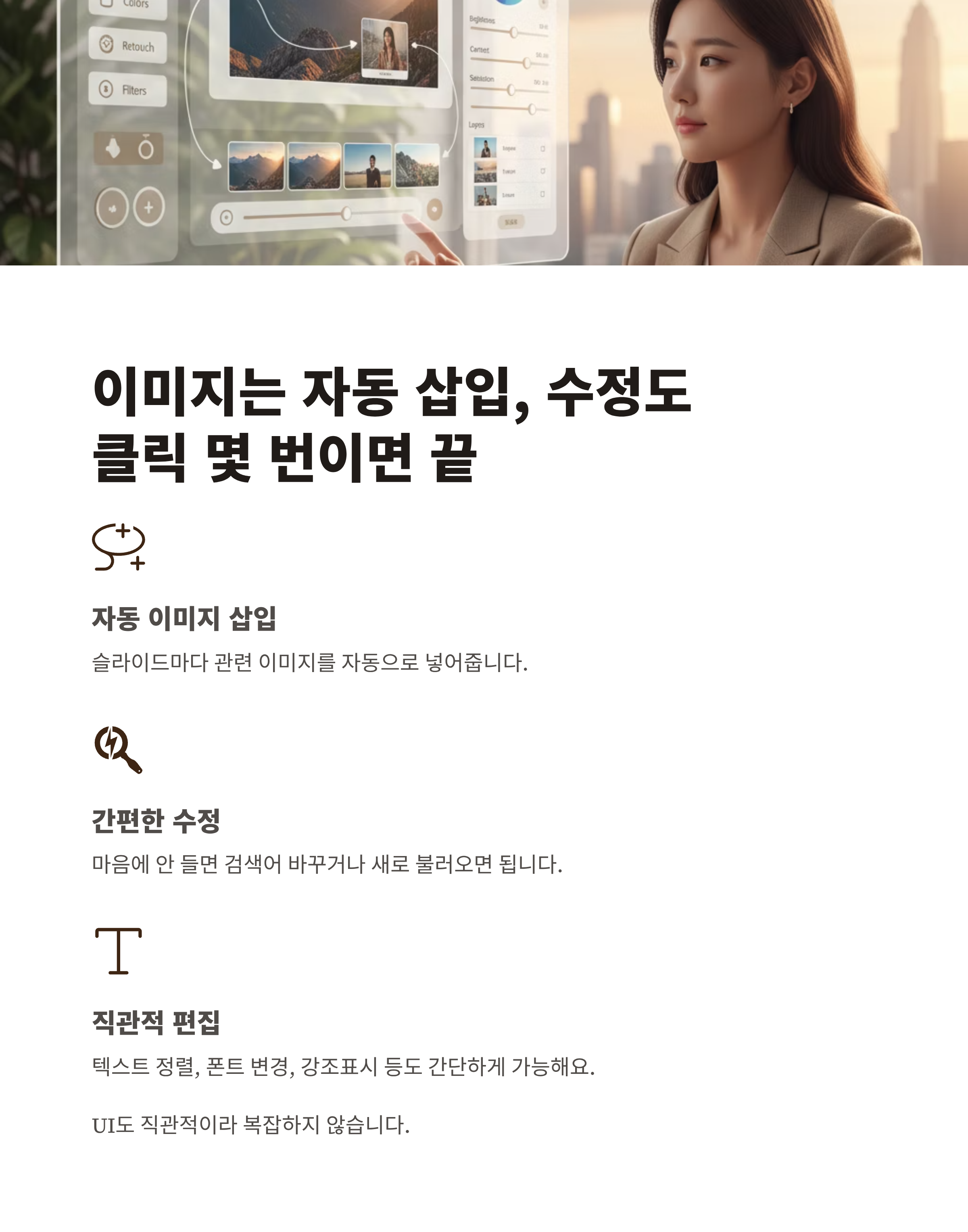 슬라이드 구성, 내용 흐름, 디자인까지 빠르게 처리할 수 있어